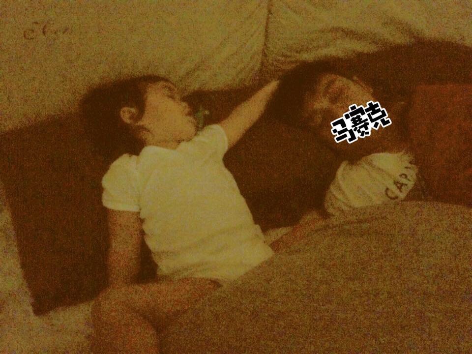 萬籟俱寂的午夜,小溫小姐扯著爸爸的頭髮入睡,看著這副溫馨(殘暴)的畫面,媽媽表示欣慰。