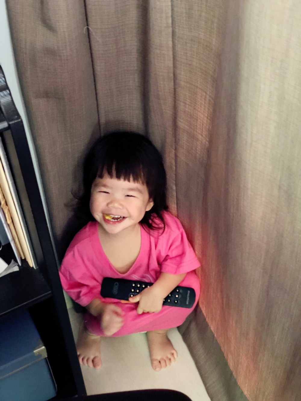 圖片是我守護的小人兒,她偷了餅乾躲起來吃,以為把自己藏的很完美。為了這傻裡傻氣的笑容,我甘願變成又狼狽又崩潰,又愚蠢又痴心的傻媽媽。