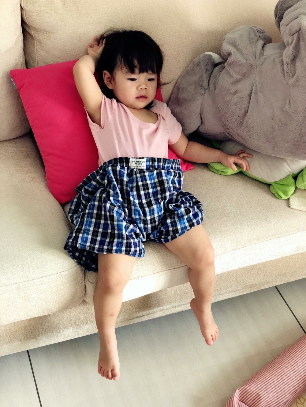 圖片是小女穿上爸爸的褲子,把婚後男人沙發懶漢模樣模仿的精凖到位。