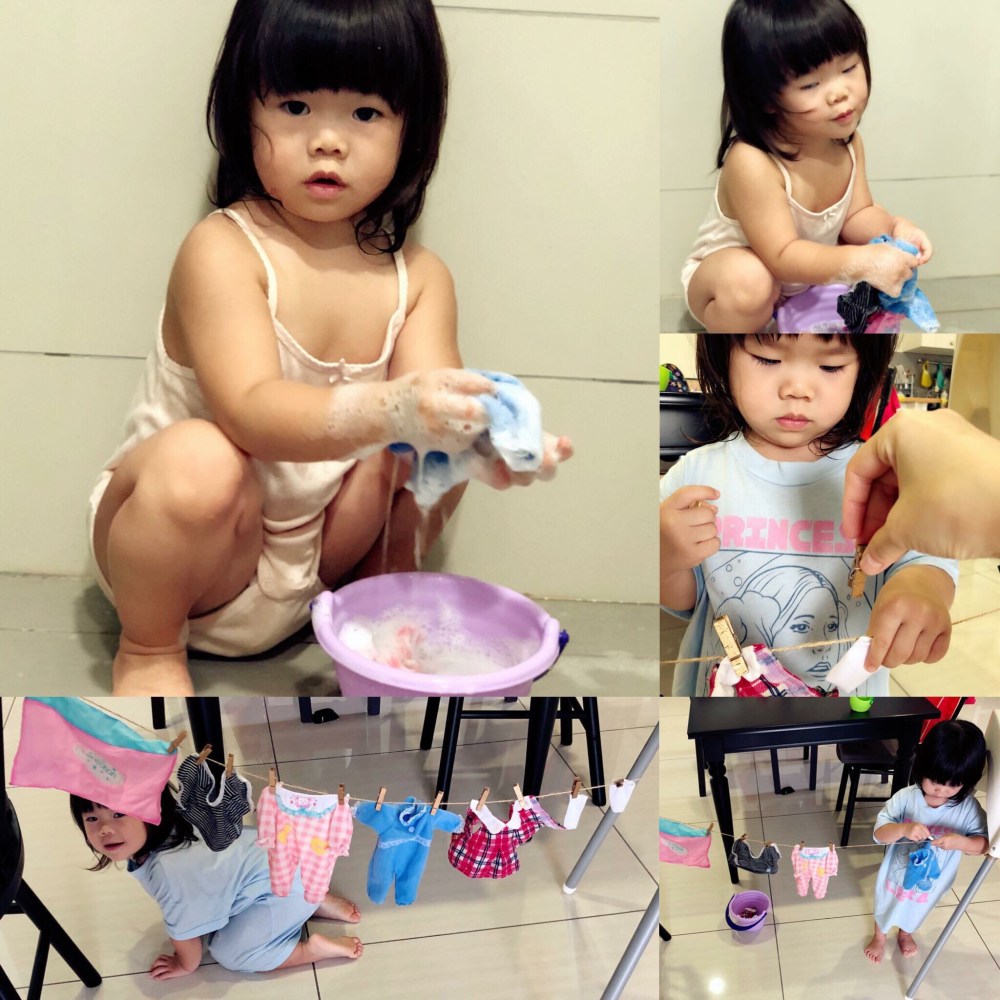 每次曬衣女兒都想幫忙,但衣服太大件她總做得不順手,於是讓小妞學習自己洗曬娃娃衣服。她玩得非常開心,很有成就感。而且,還消磨了將近一個小時!