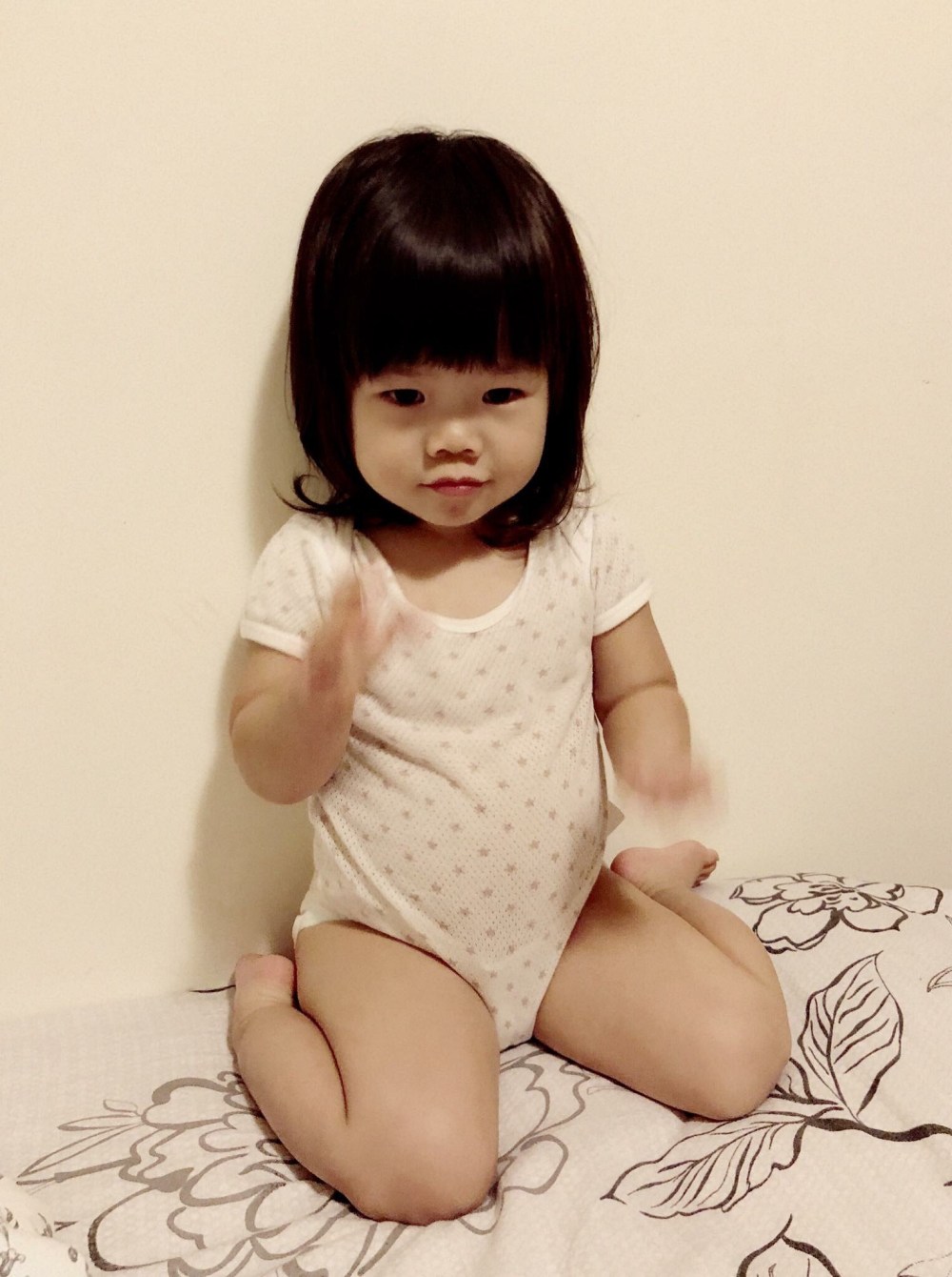 小妞已經會變換句型中的主辭了,向別人道謝時如果聽到對方說"不客氣",她會立馬接上"那是你應該做的"。