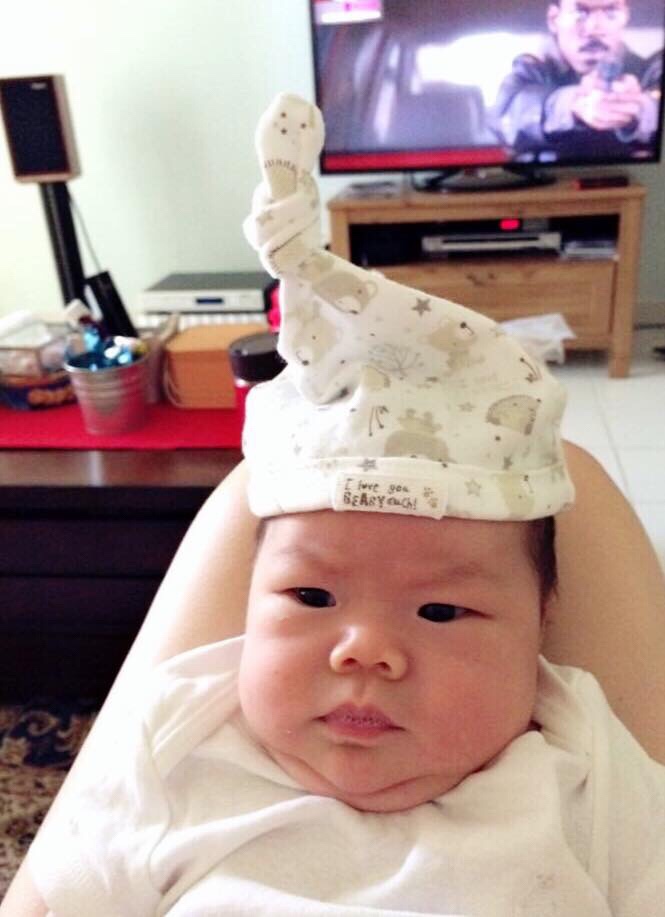 圖片是一個多月大時,戴上懷孕時娘親母愛爆發買的可愛帽子。因此而非常不爽,橫眉豎目的小溫小姐。