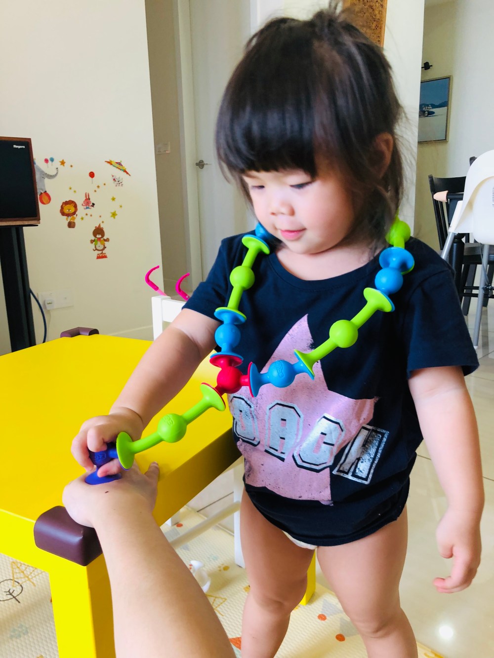 小妞很早就不把玩具塞嘴裡了,所以在我的監督下讓她試玩。比大款來的輕巧,更容易做成手鍊項鍊配戴。