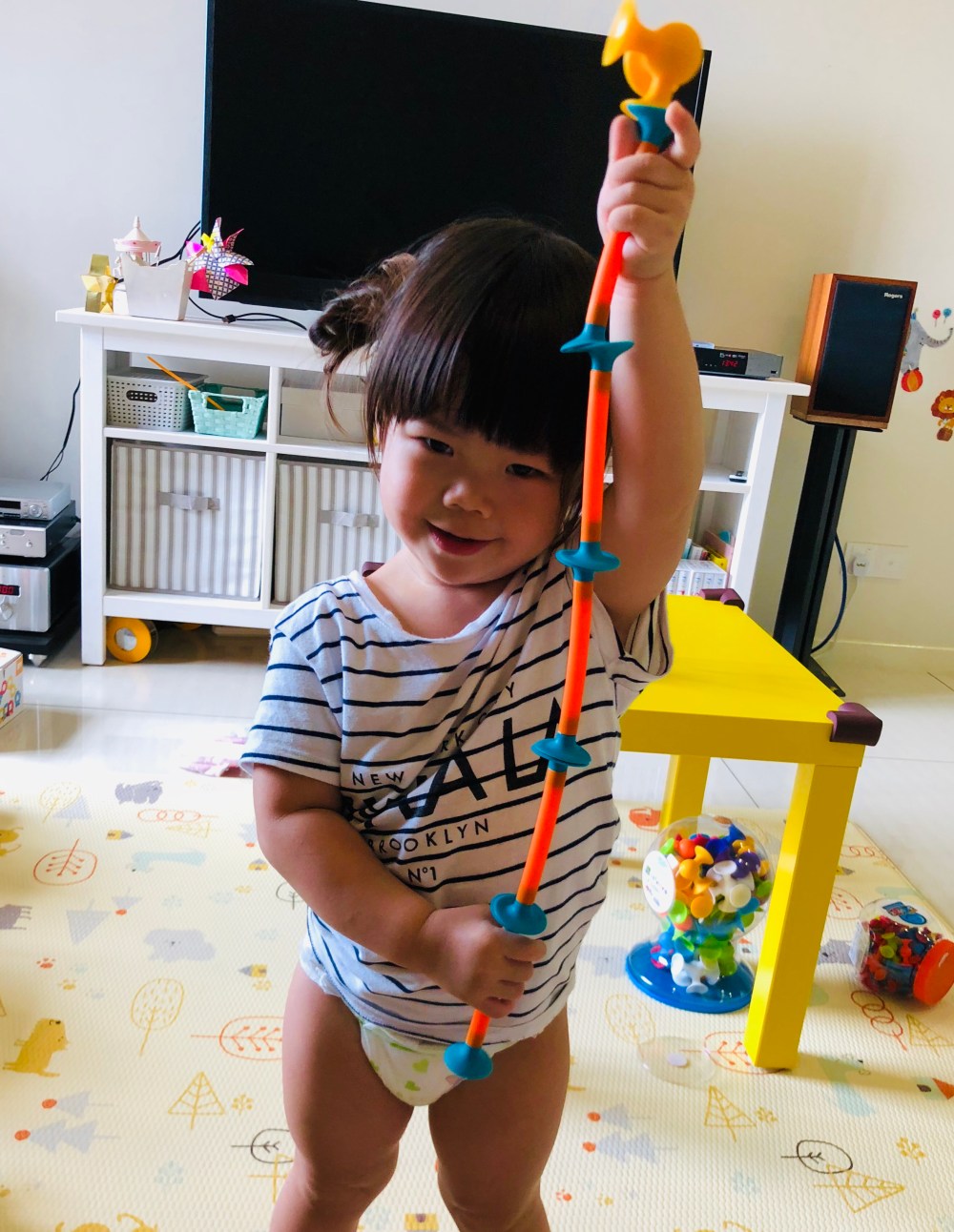 最後還拿來射飛鏢,需要某個角度和力道才能黏上,小妞意外地掌握的不錯呢!