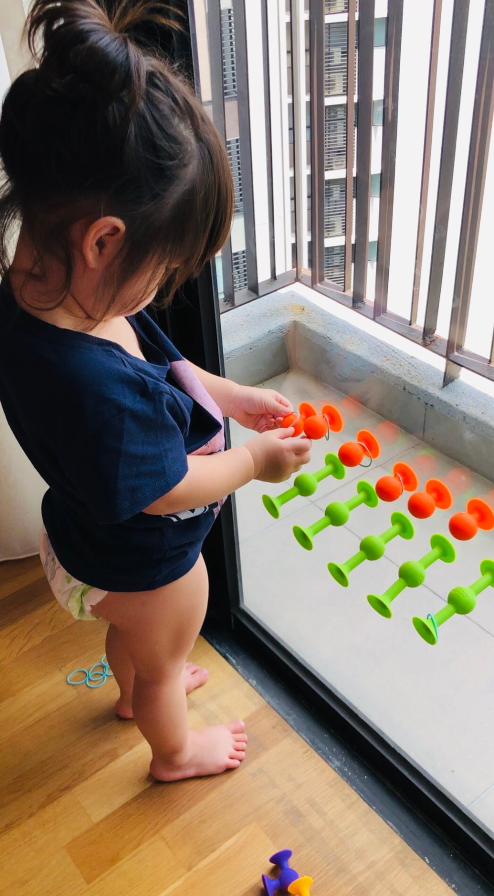 黏到玻璃上試著把圈圈套上,訓練小手指的靈活度和專注力