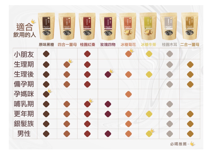 詳細適合族群如下圖,有小皇冠就是必喝推薦的品項啦!