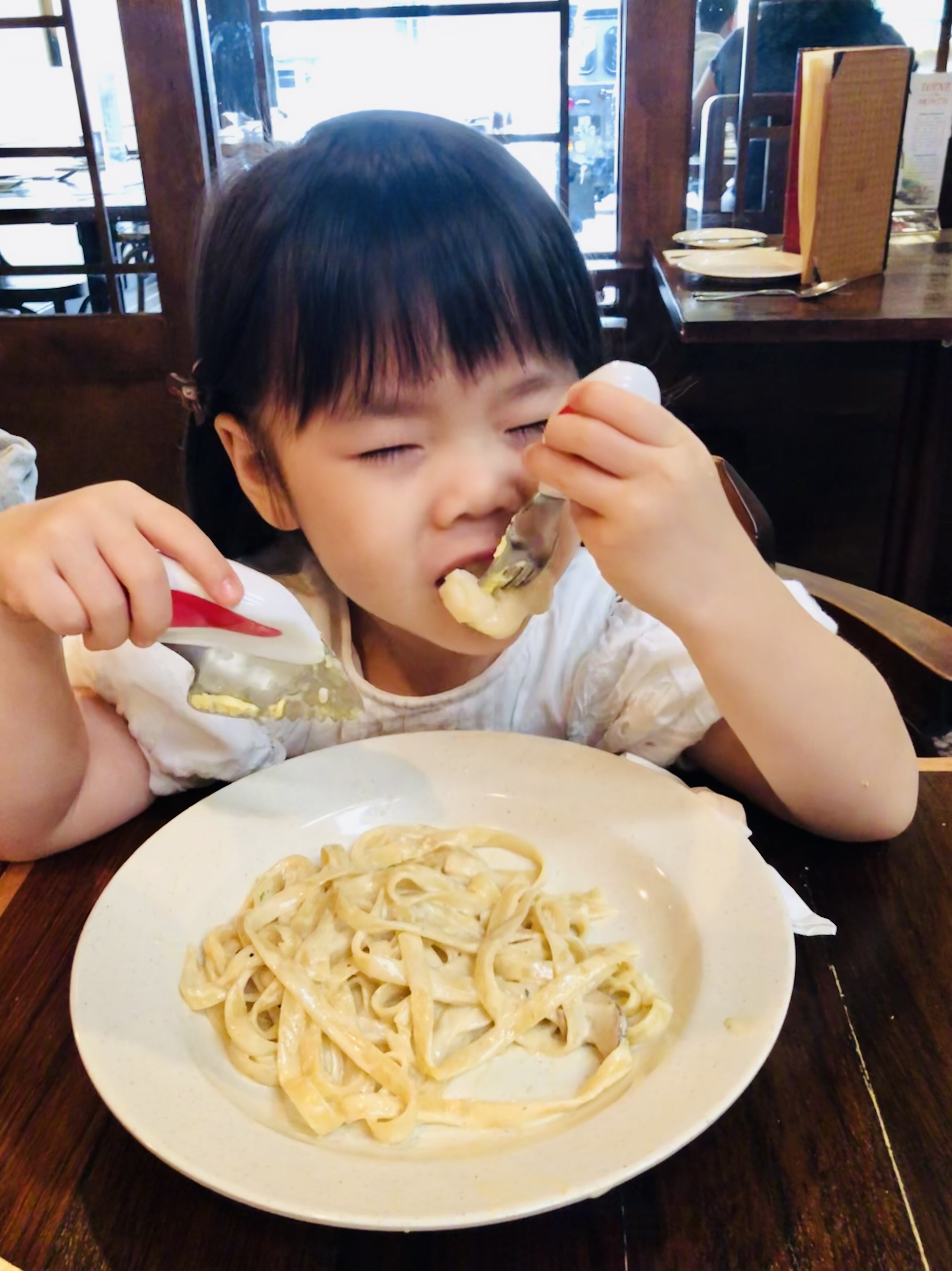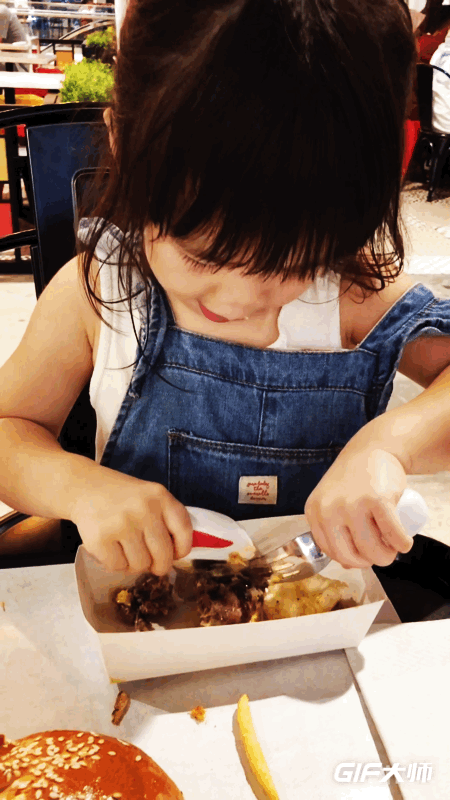 試著自己切牛排,餐桌禮儀從小培養。(牛排肉質比較難切斷,還是要大人幫忙)