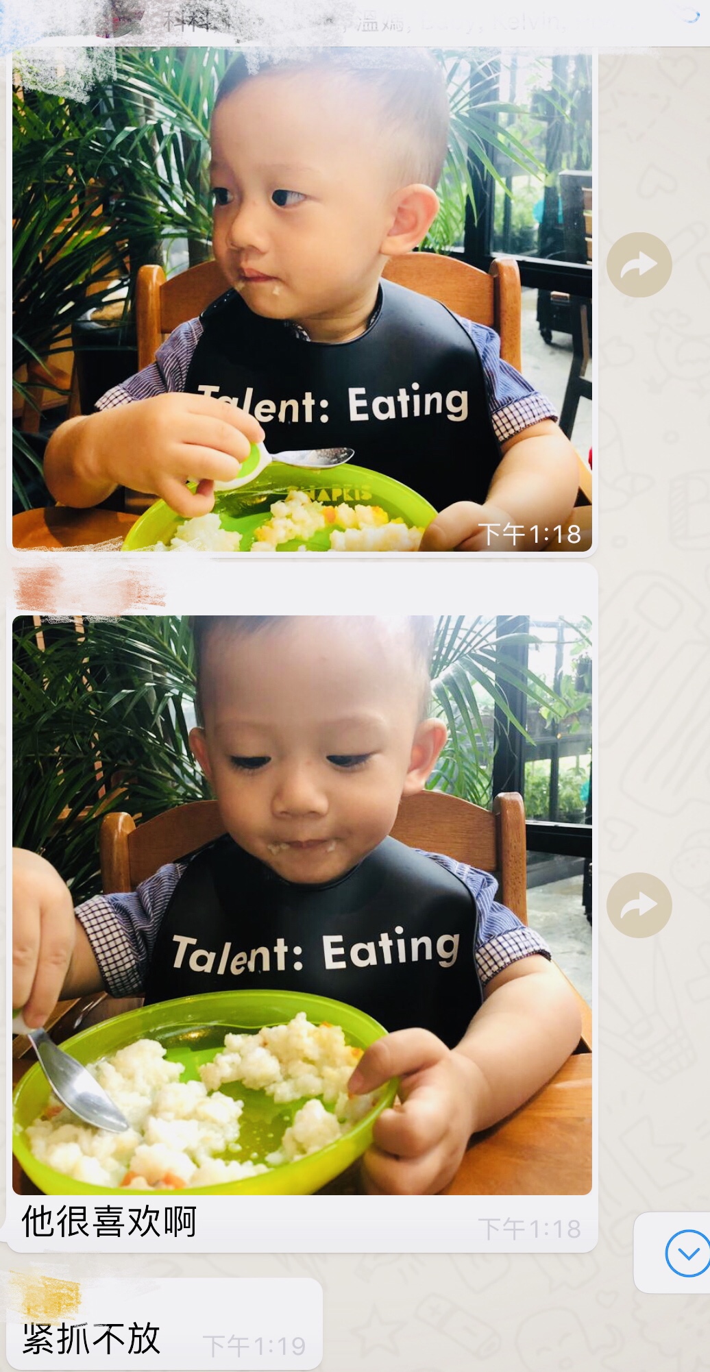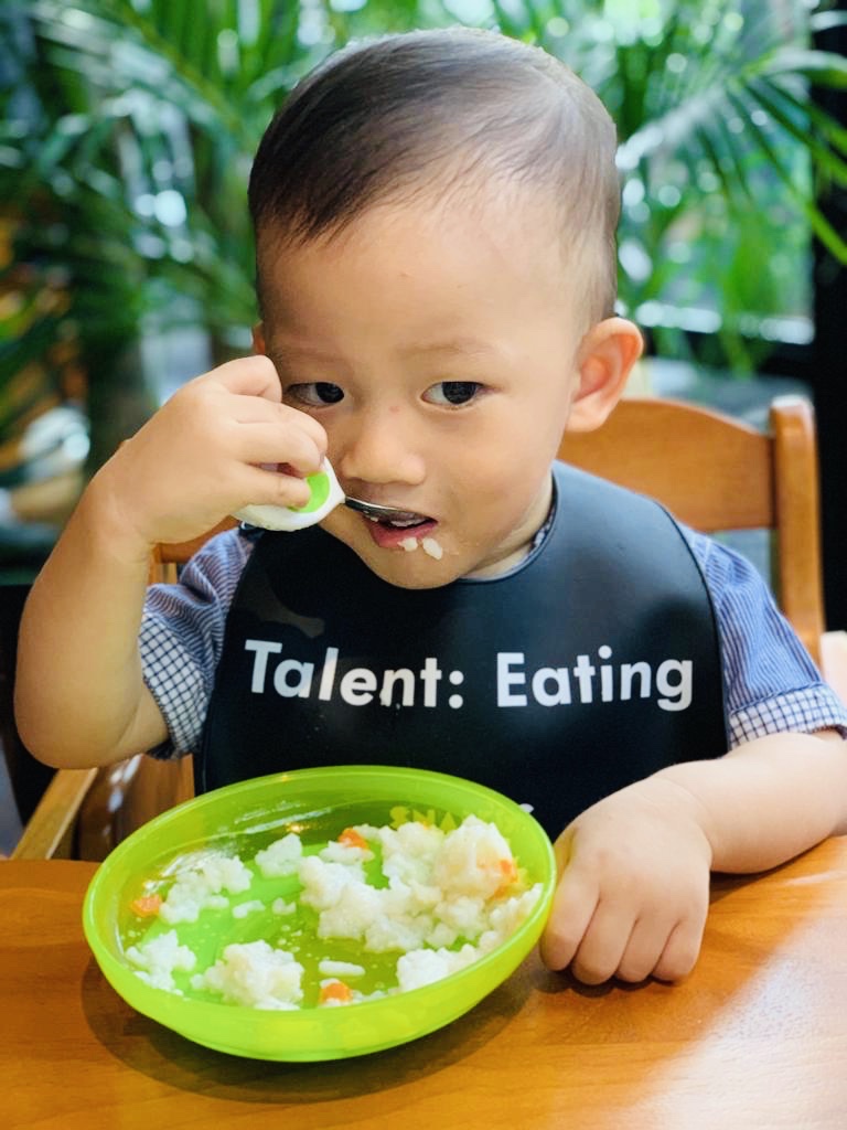 娘娘一歲八個月的帥堂弟,第一次使用湯匙就抓得牢牢把食物送進嘴巴,非常順手!