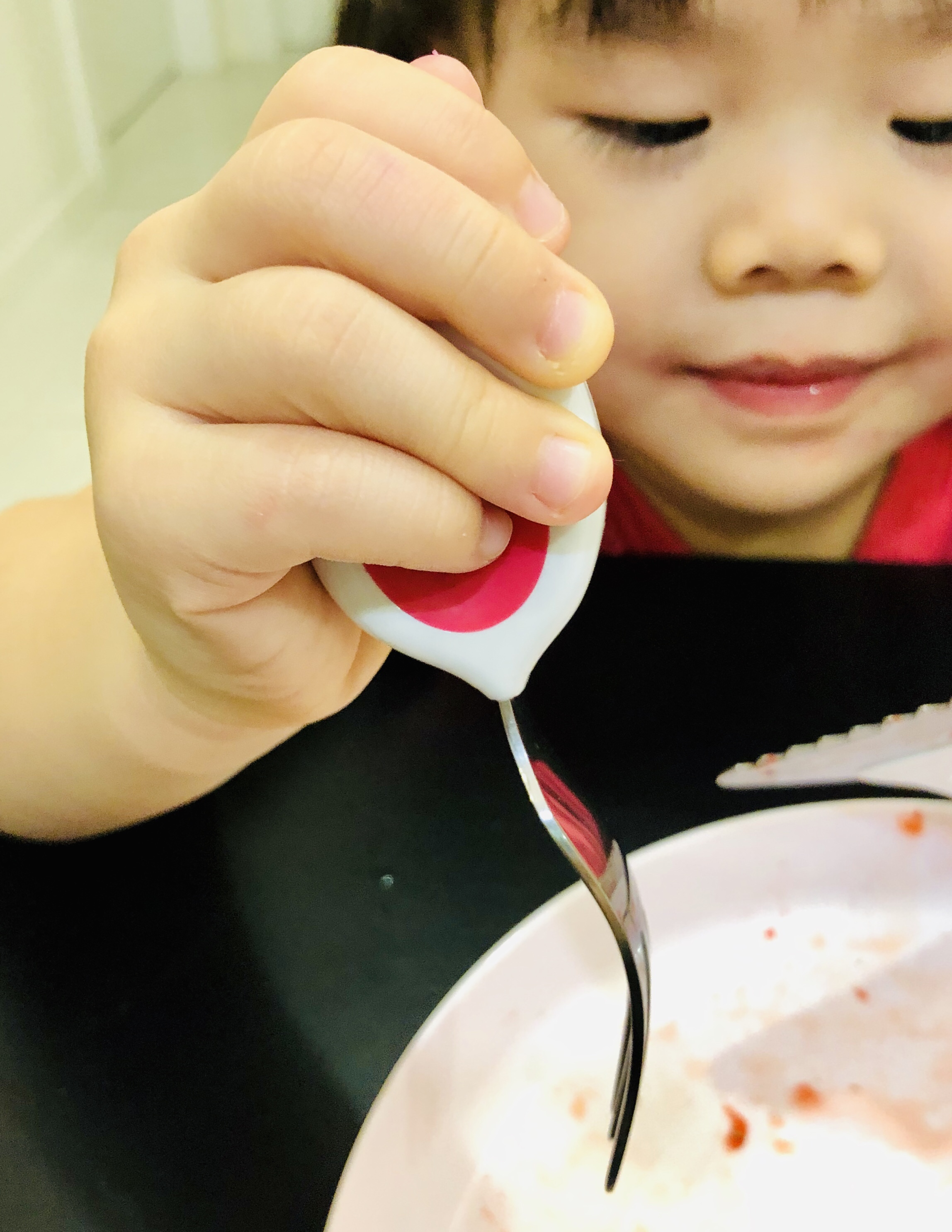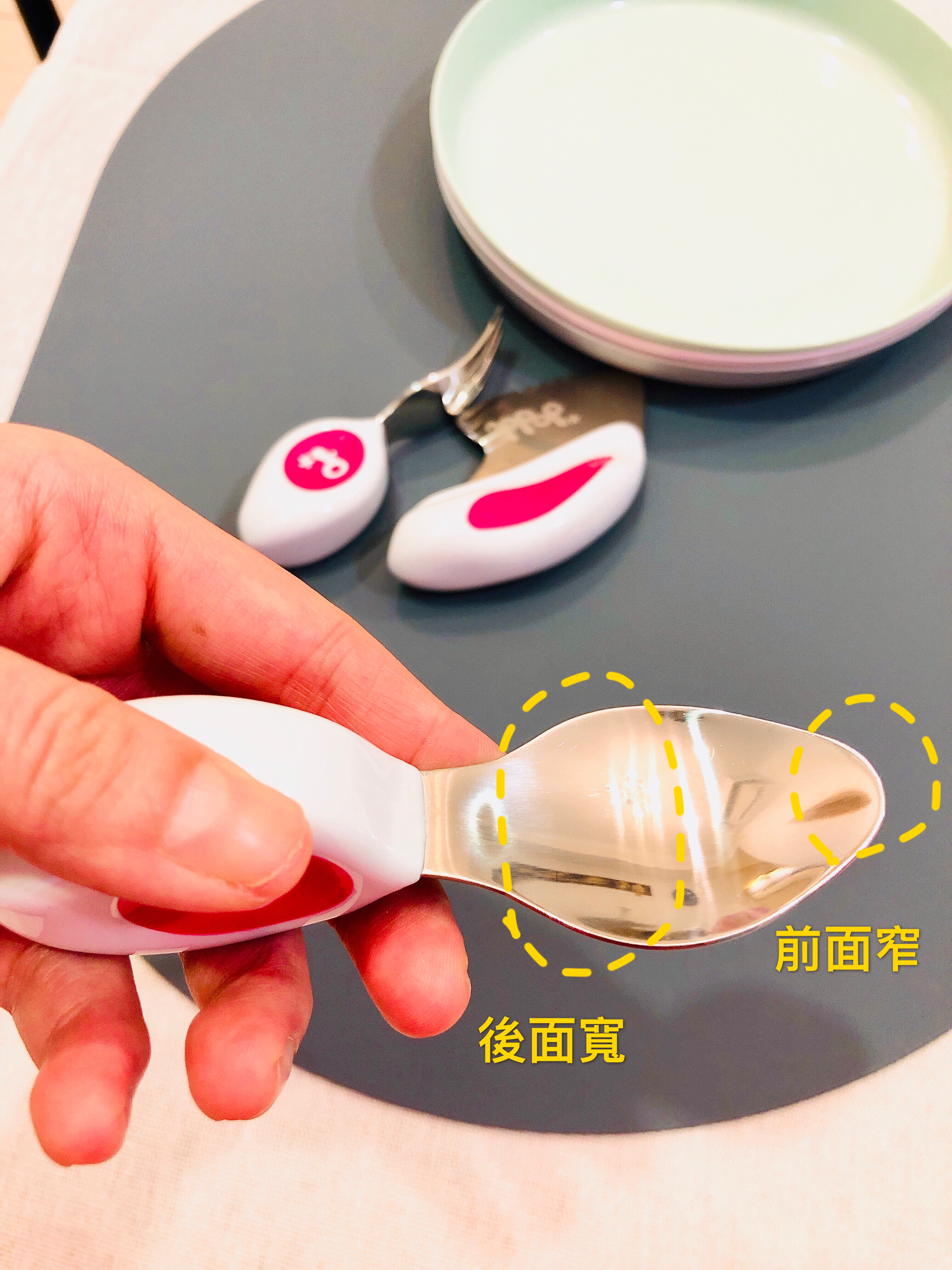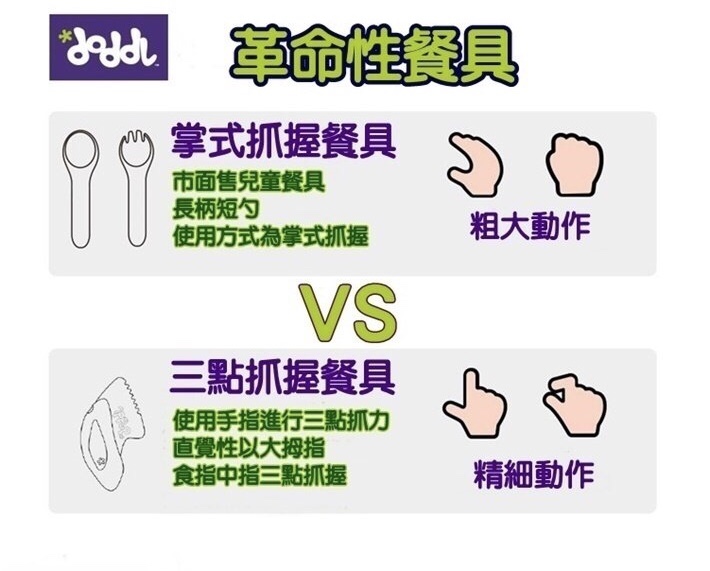 寶寶其實對"拿"的技巧還不能掌握的很好,是用"握"的在學,所以一般餐具他們容易抓不穏,也不易使力,常掉落餐具或無法順利將食物送進口中。