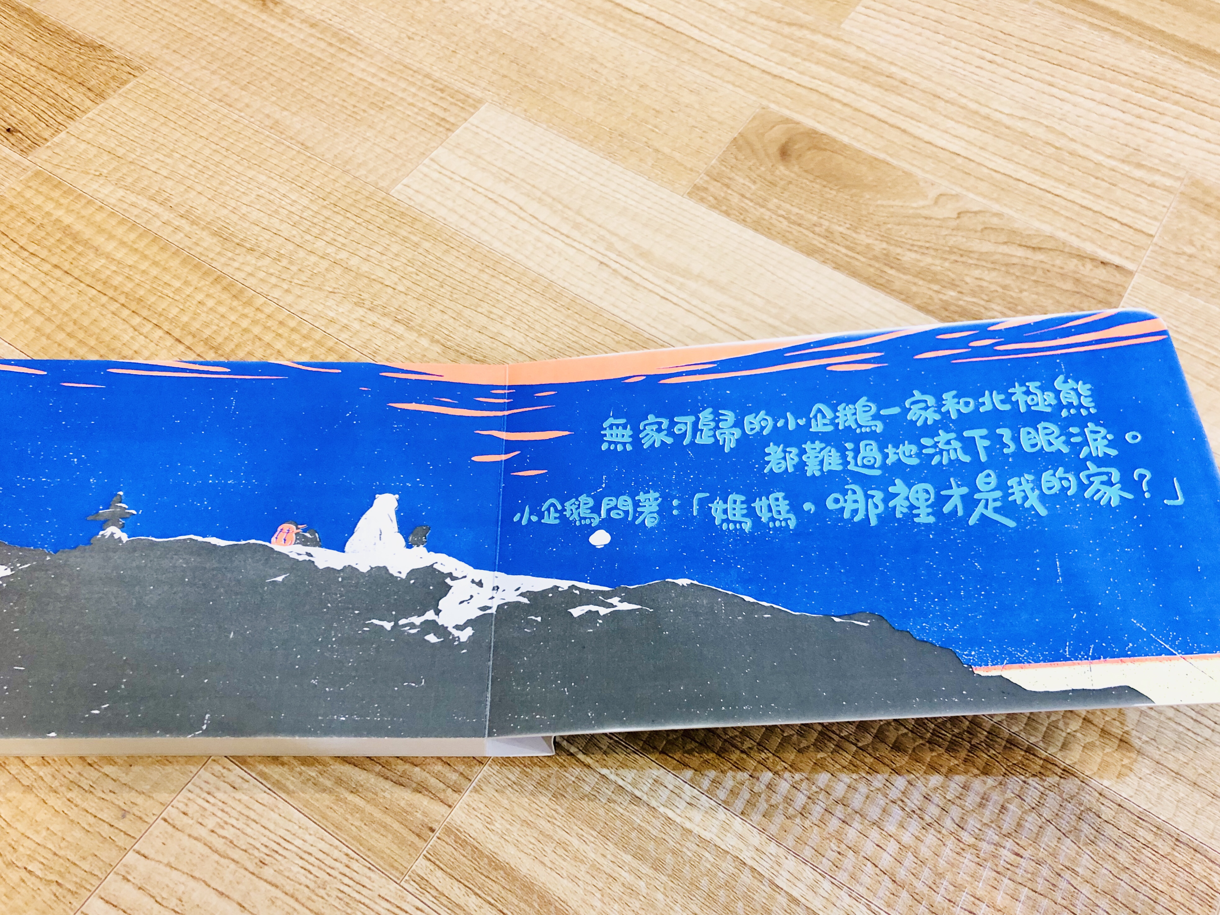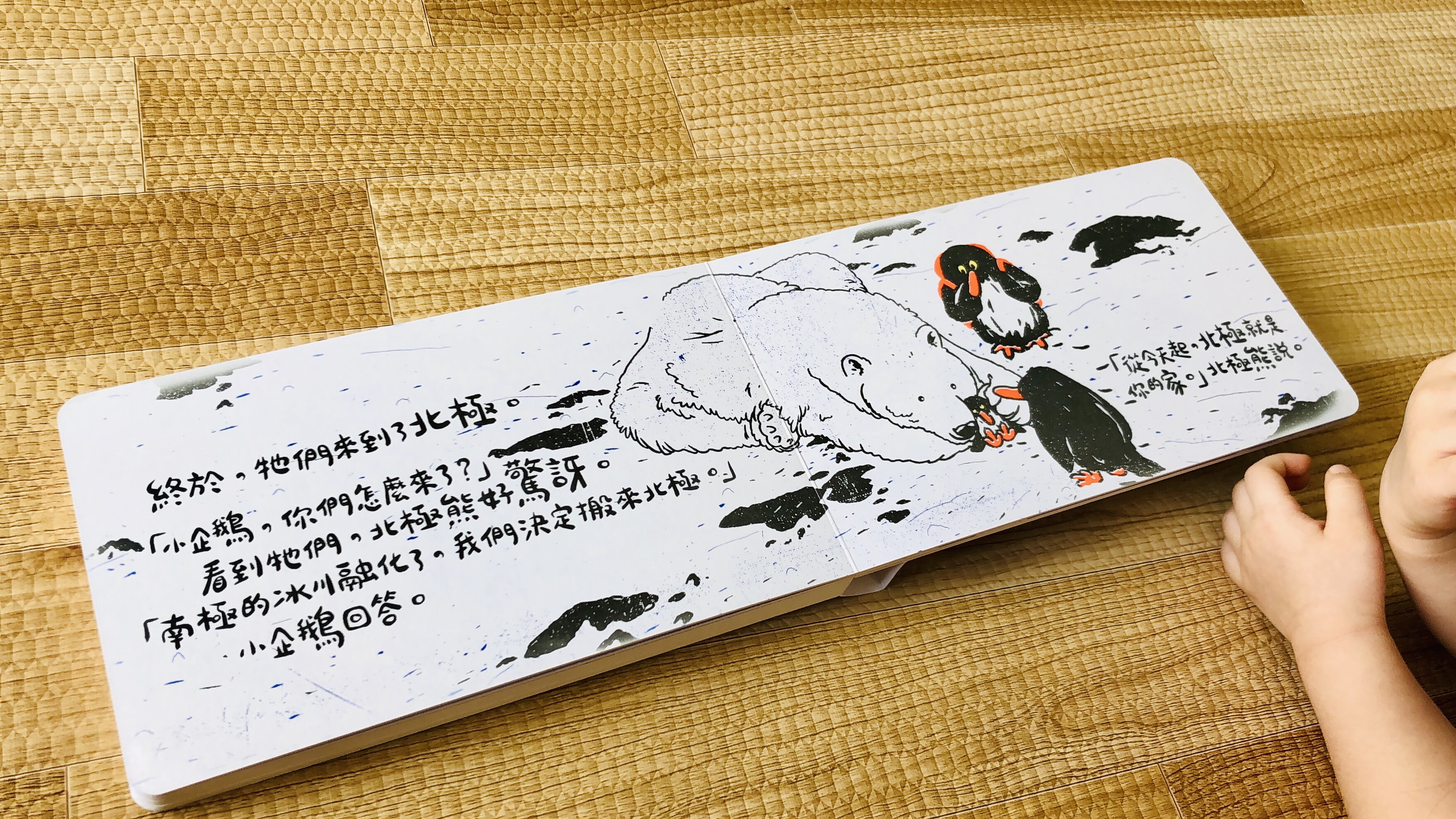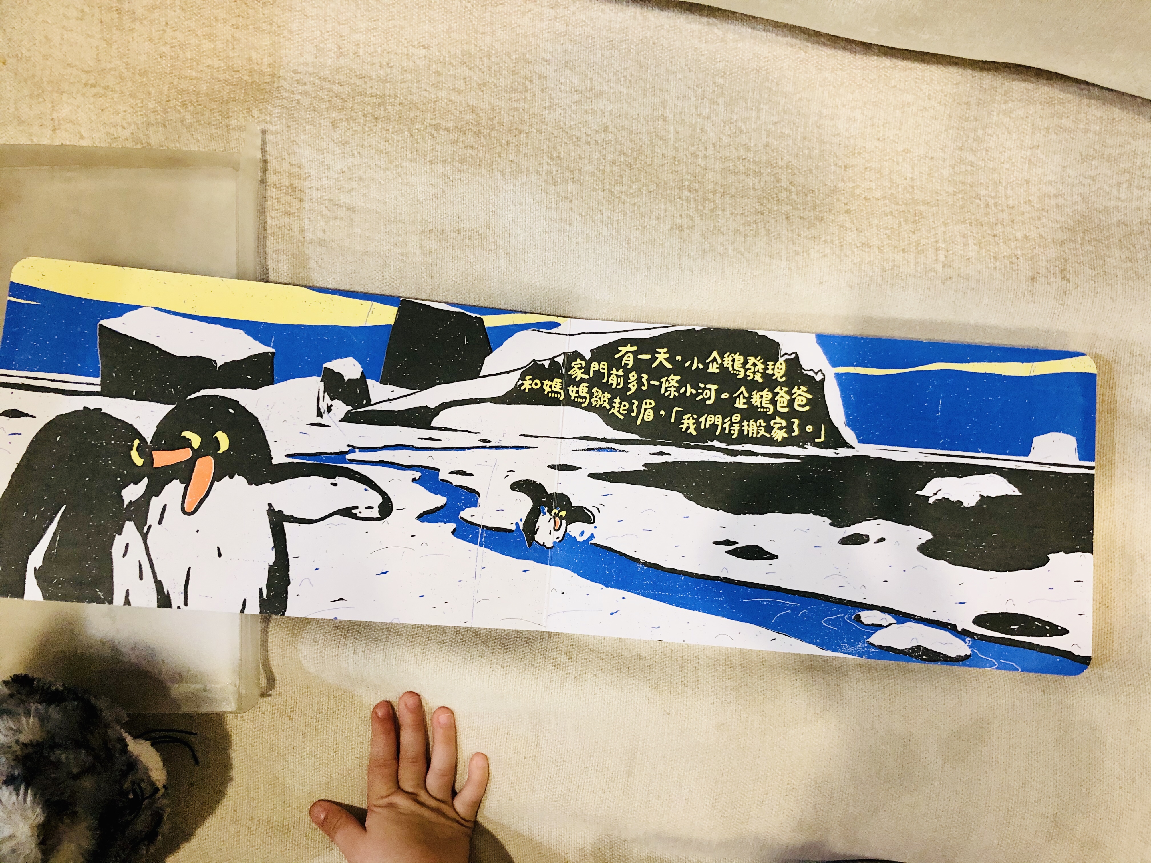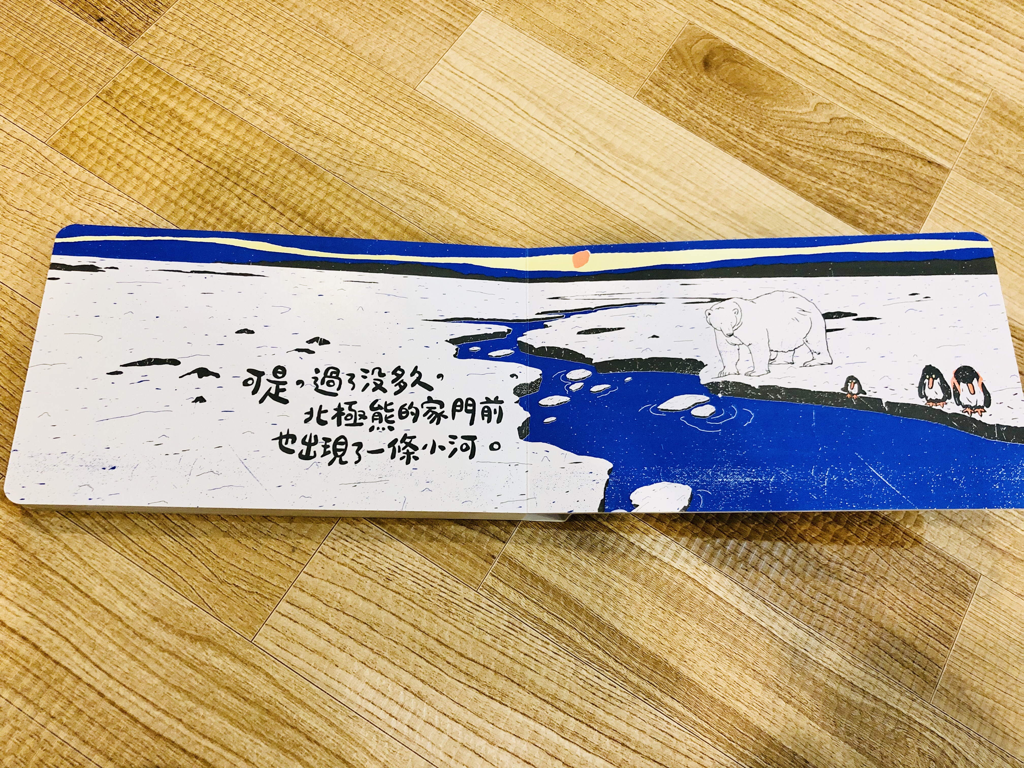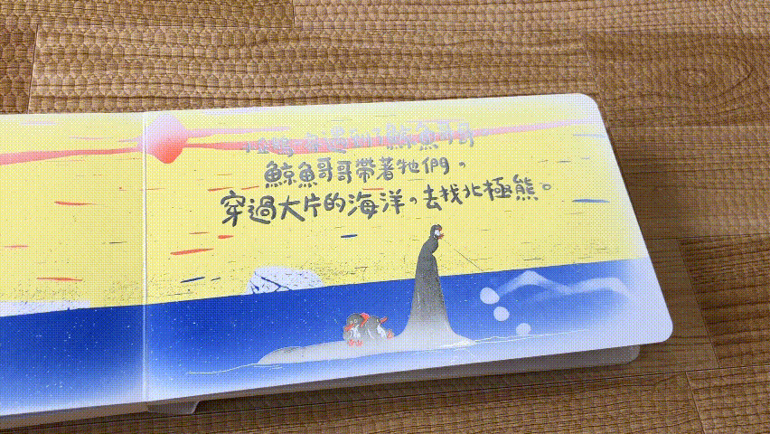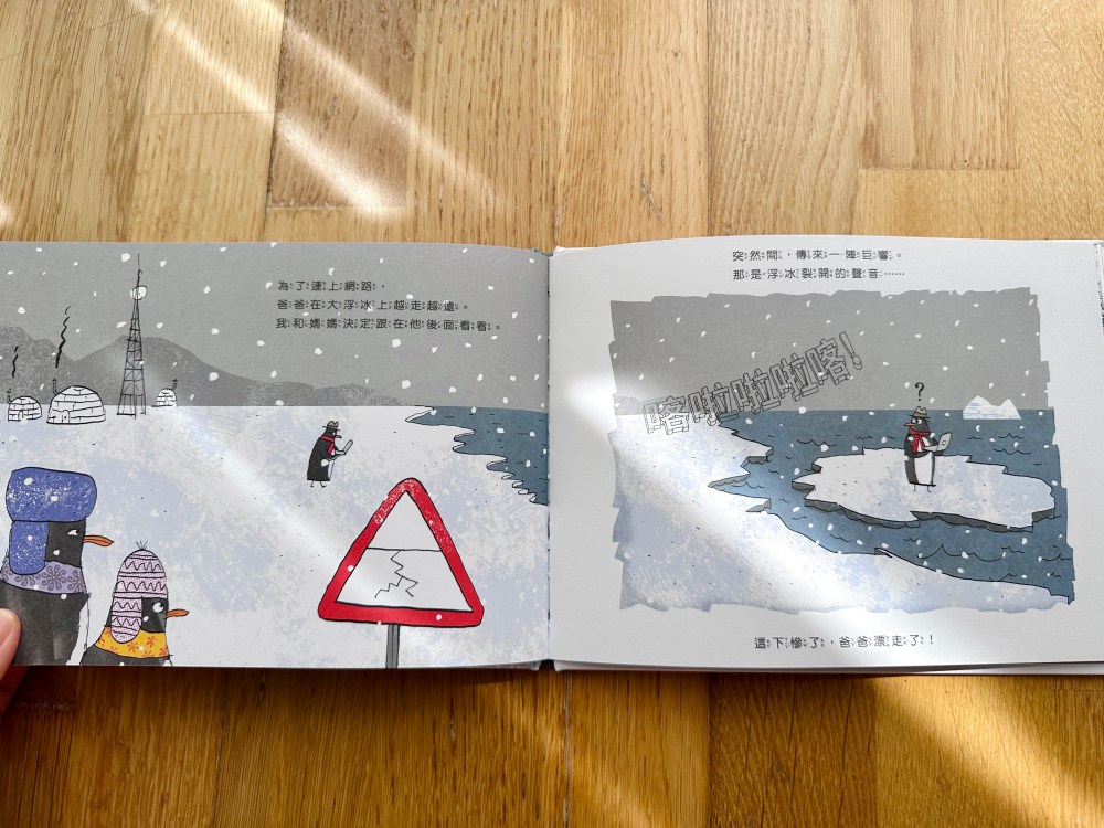 你會發現書頁上的圖像和顏色有驚人變化!南極的冰川融化了,小企鵝一家只好踏上尋覓新家的旅途,