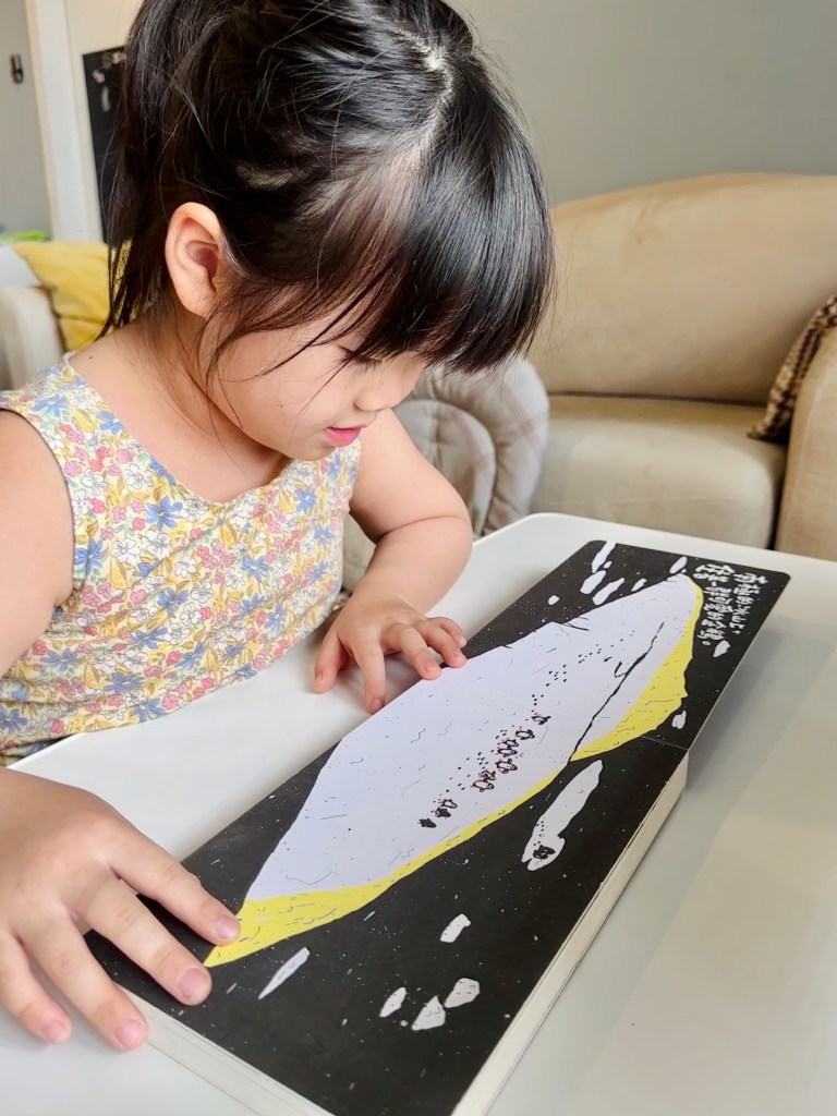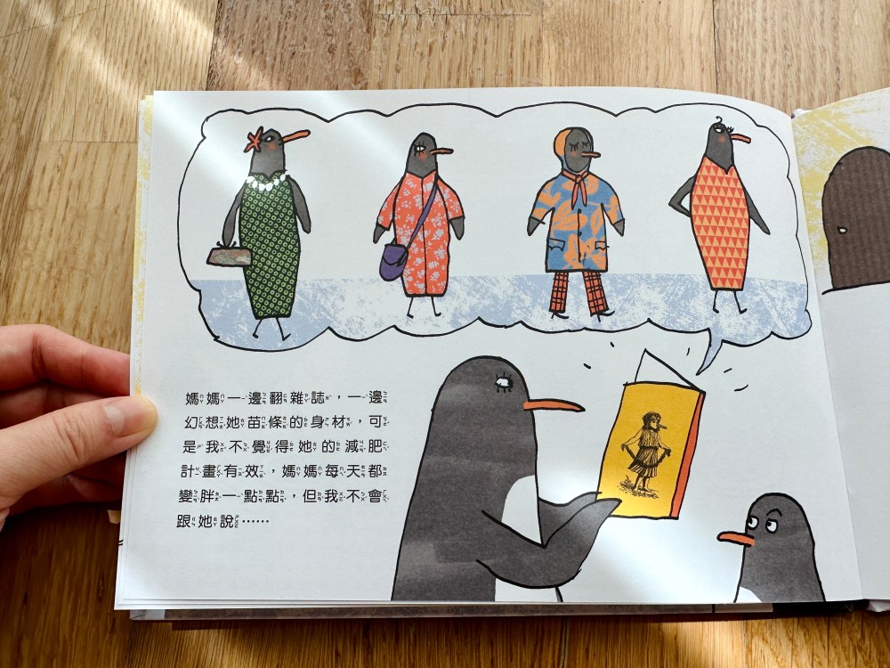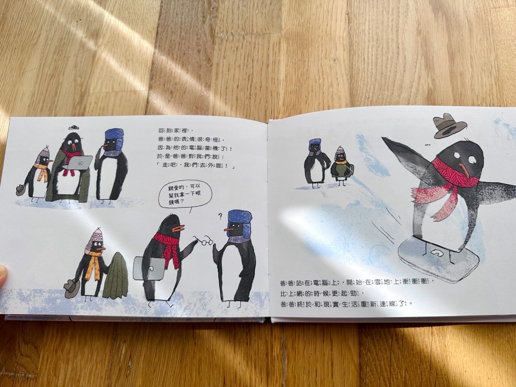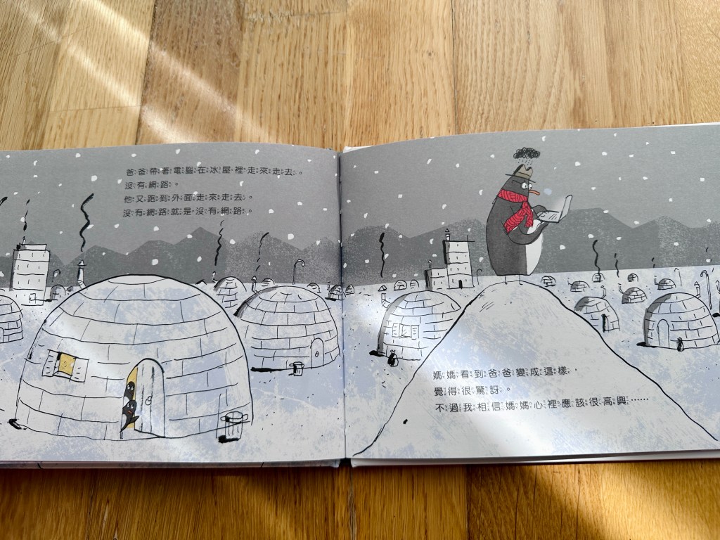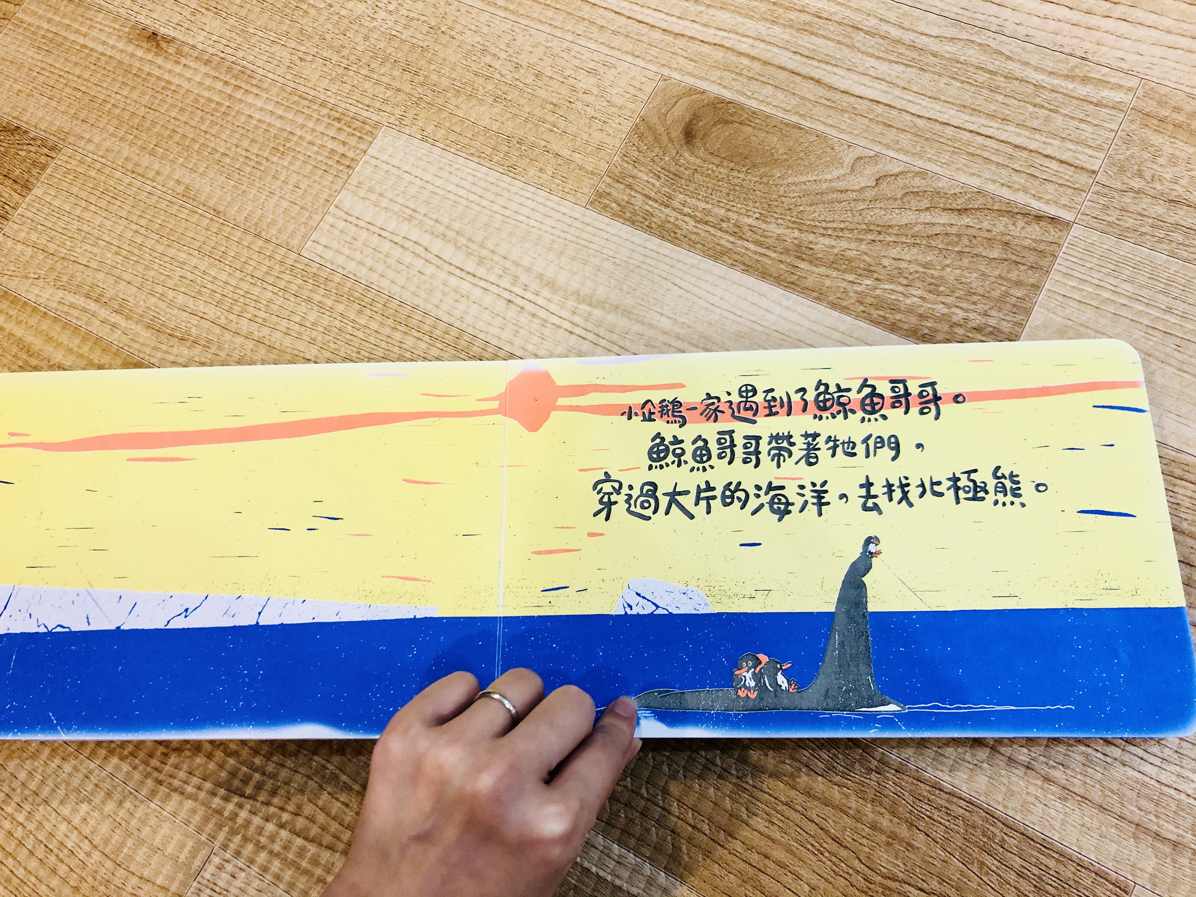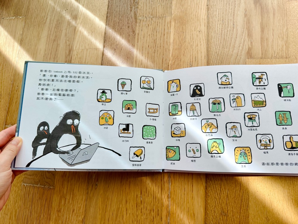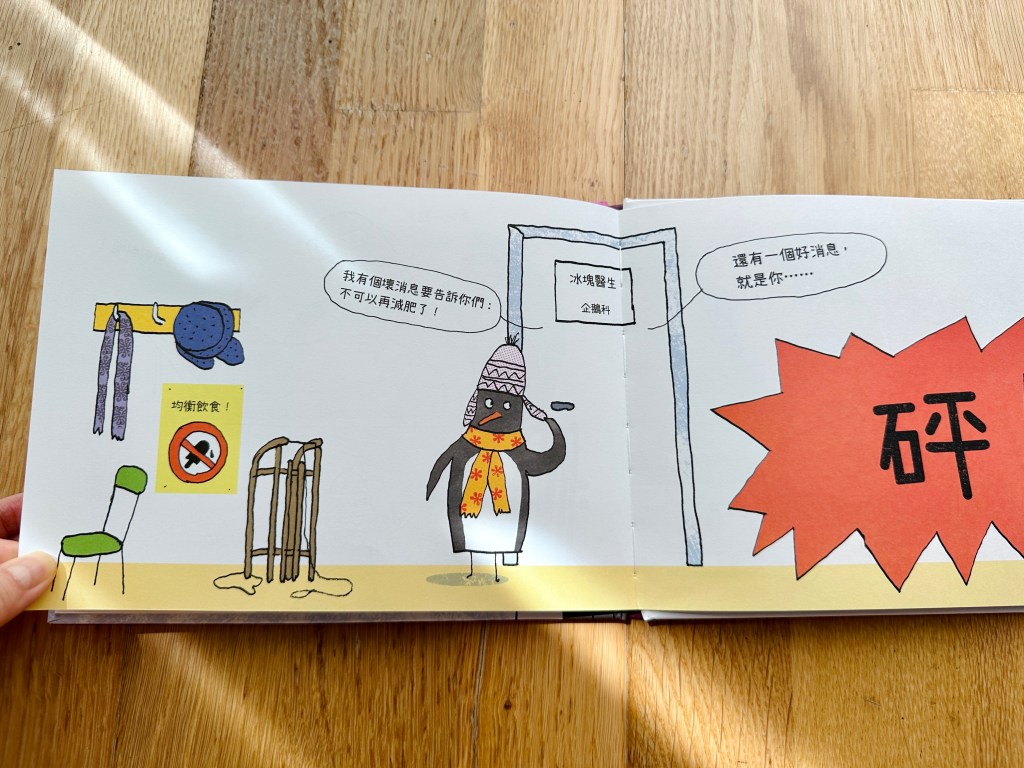 你會發現書頁上的圖像和顏色有驚人變化!南極的冰川融化了,小企鵝一家只好踏上尋覓新家的旅途,