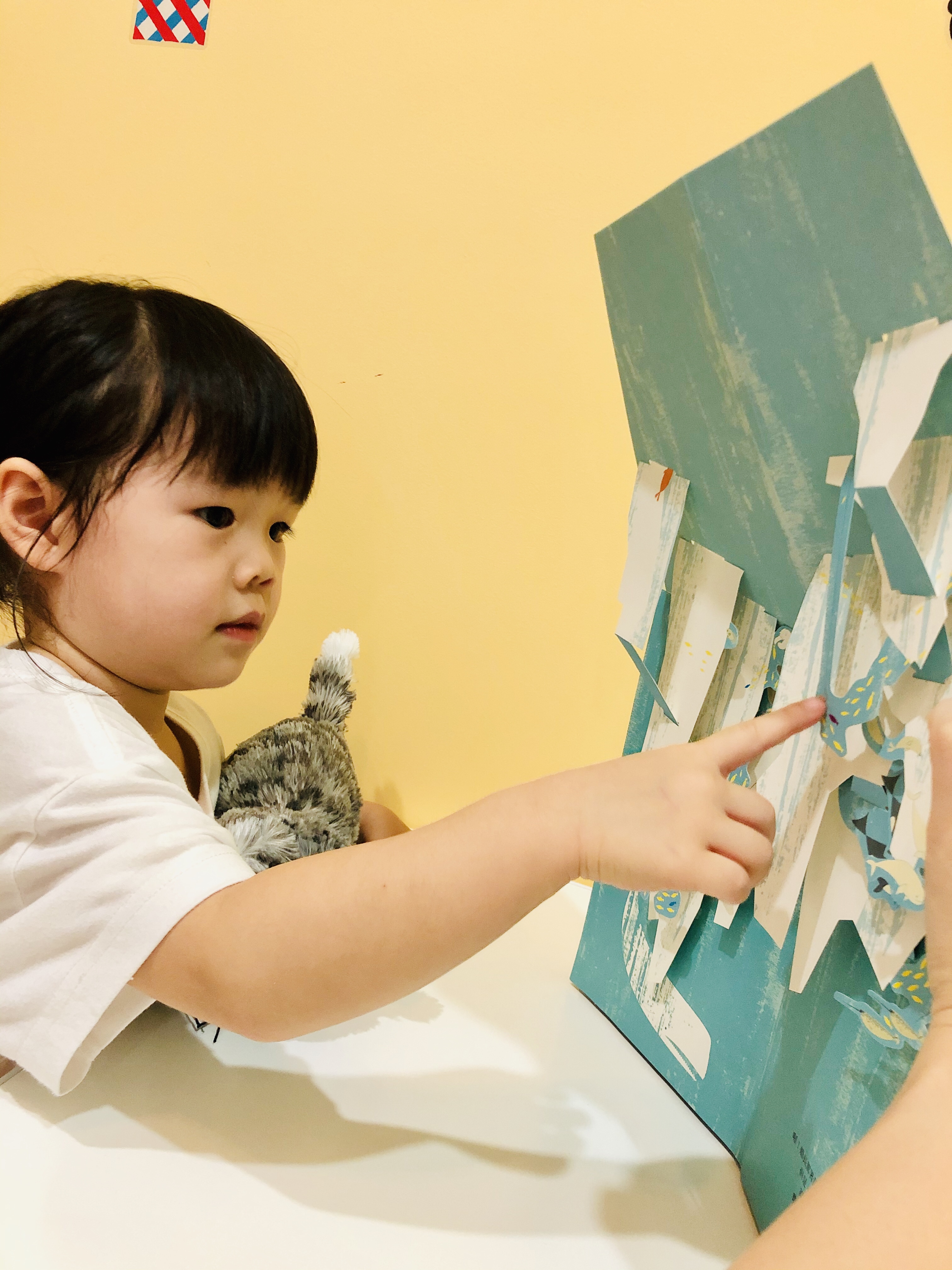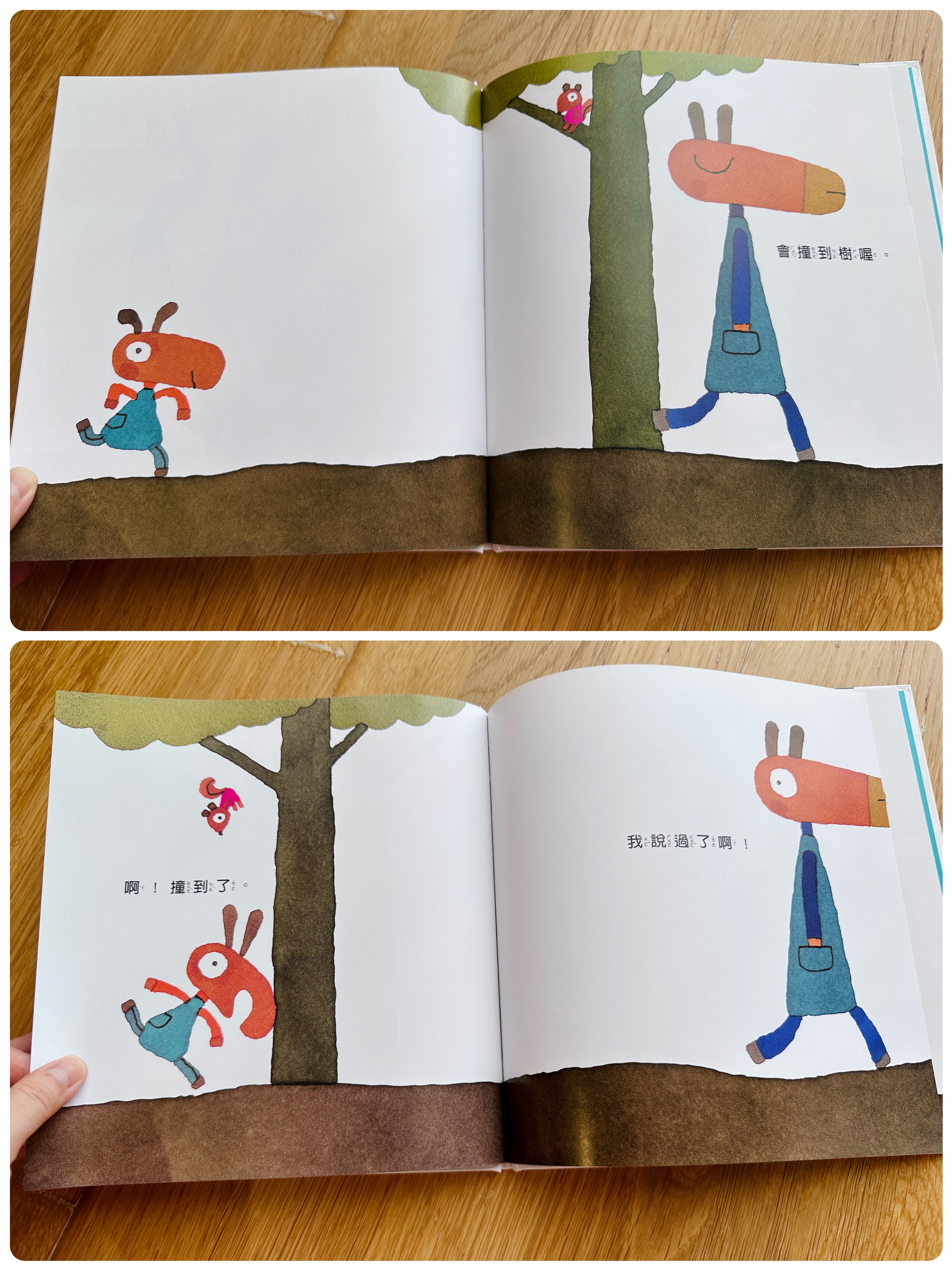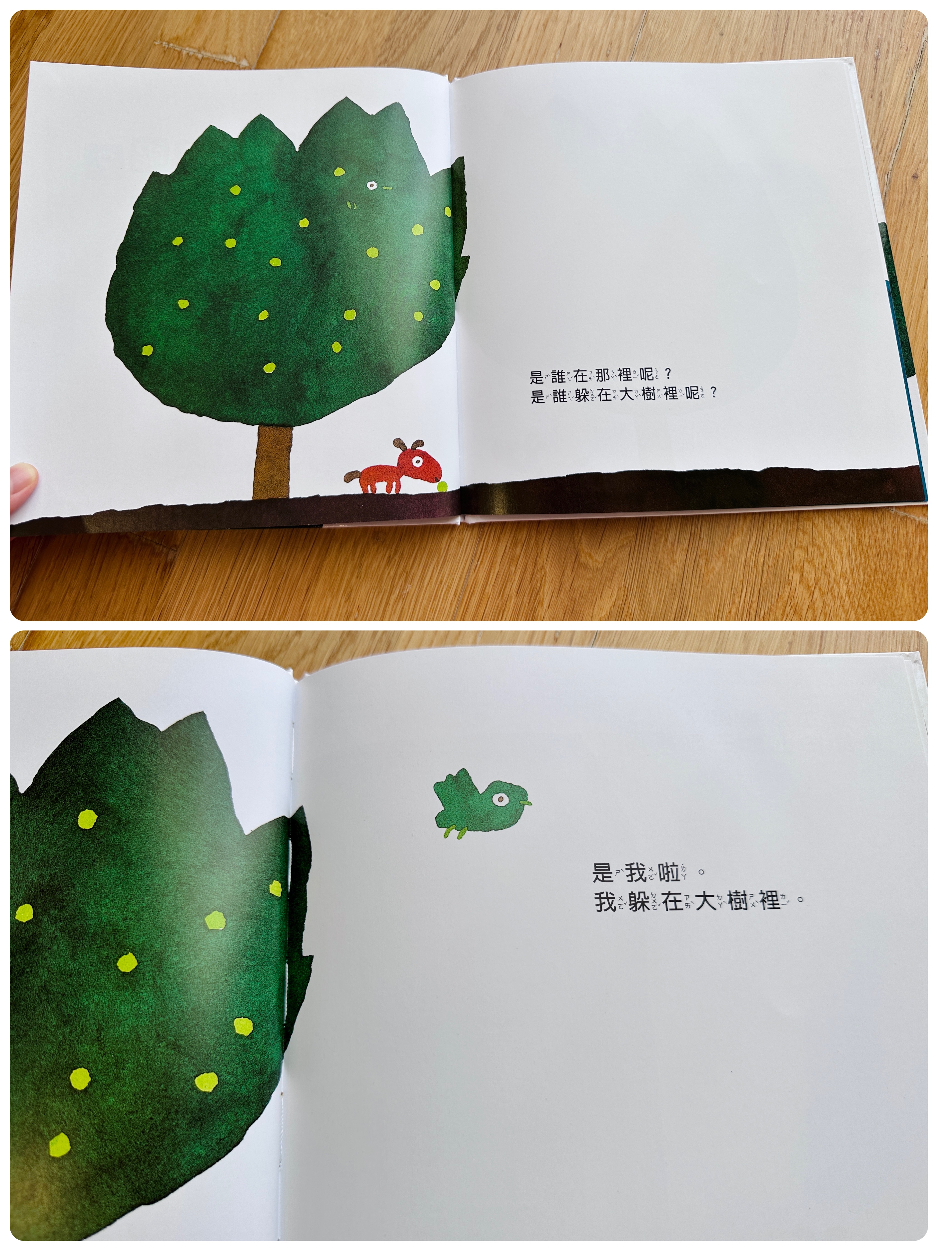 這本書沒有劇情,可以歸類為幼兒的找找書,多念幾遍他們就會記得哪裡藏了小動物喔▼