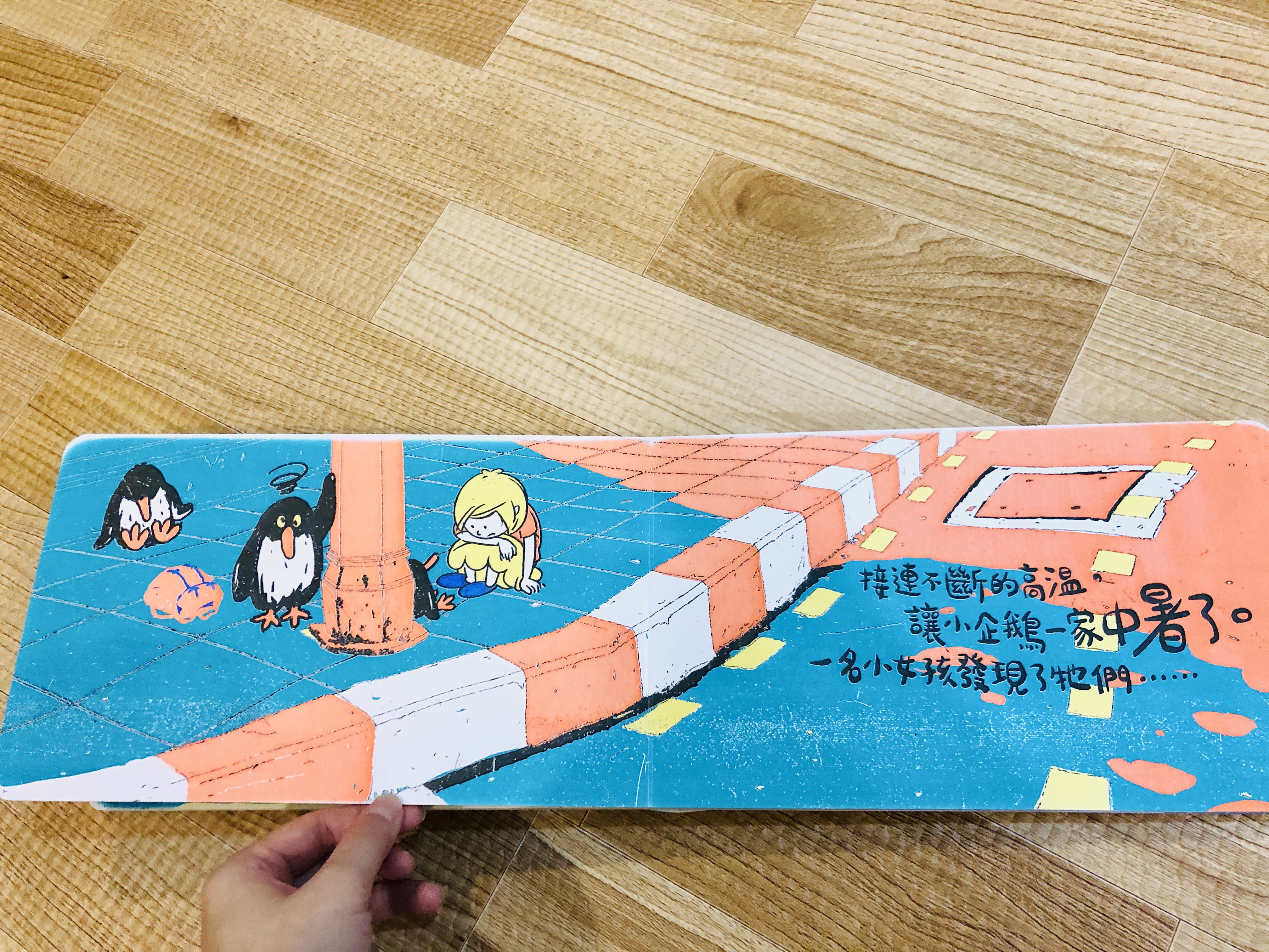 小企鵝一家在都市裡差點熱暈了,幸好碰到善良的小女孩救了他們▼