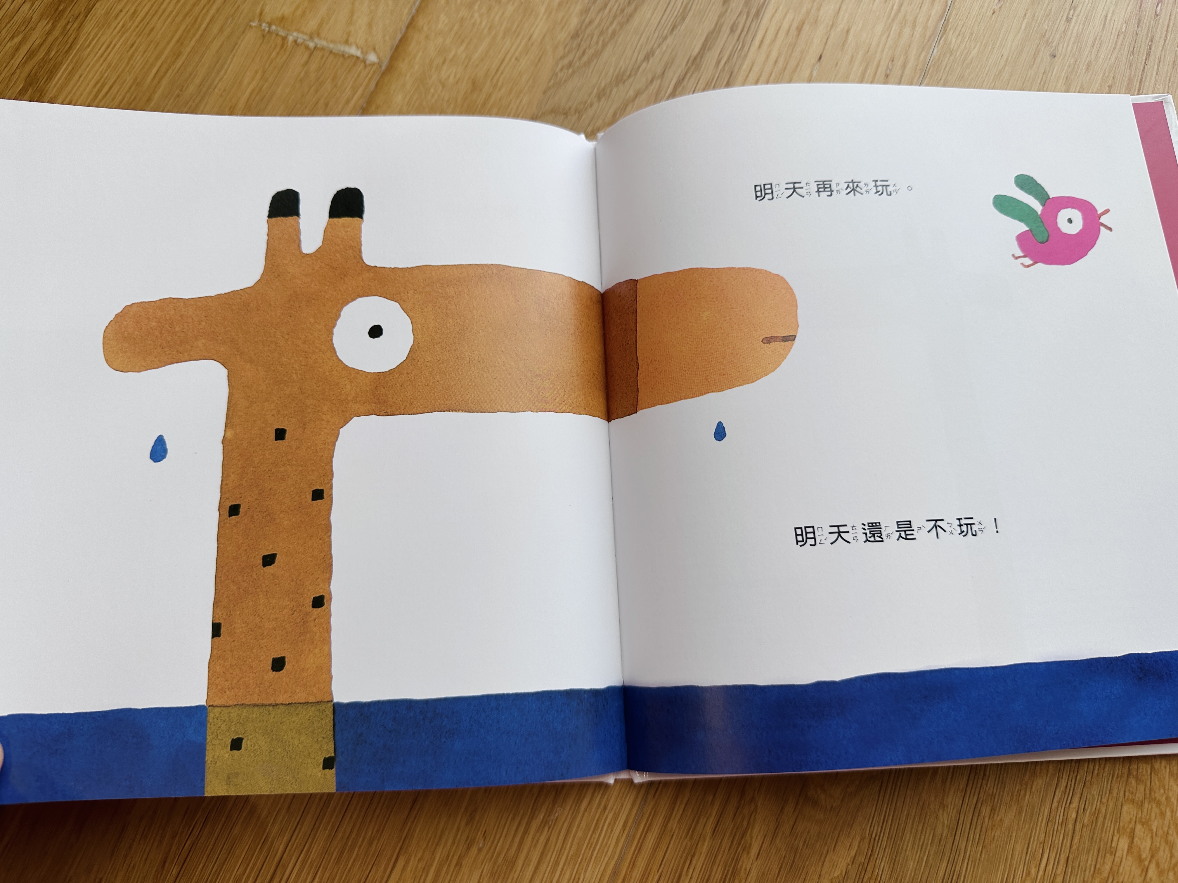 最後小鳥玩過癮了說明天再來玩,長頸鹿還是固執的說「明天也不玩!」