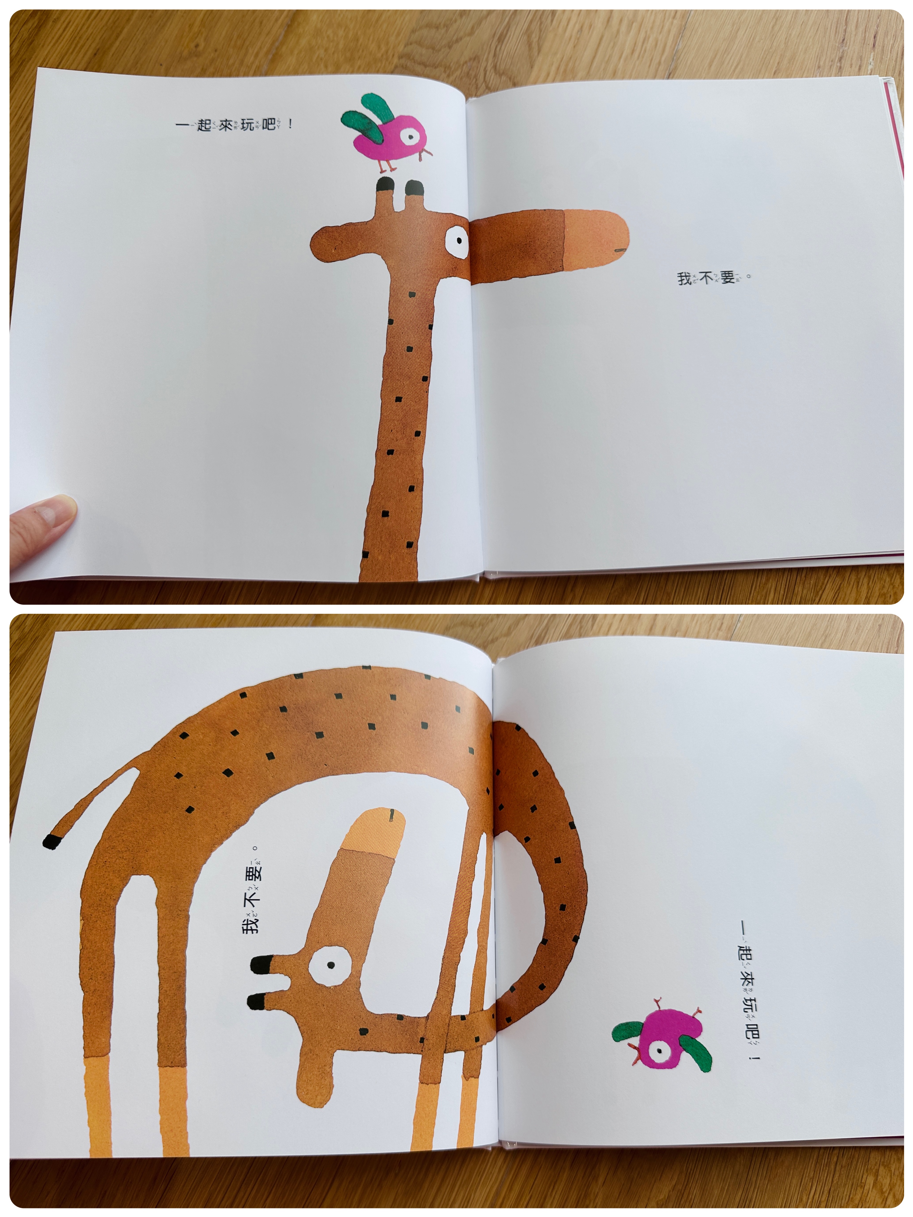 小鳥邀長頸鹿一起玩,但長頸鹿很傲嬌,一直說「我不要」