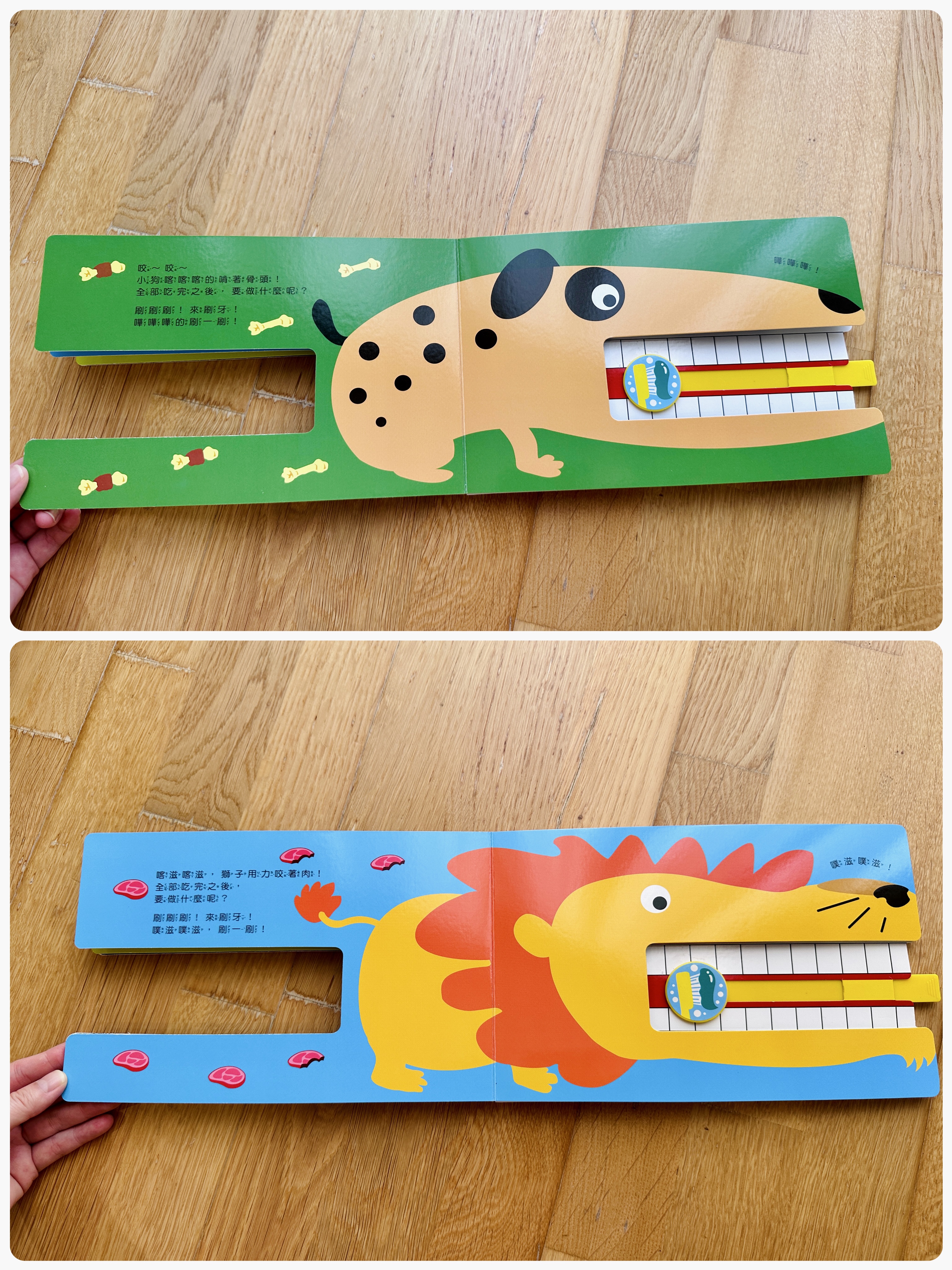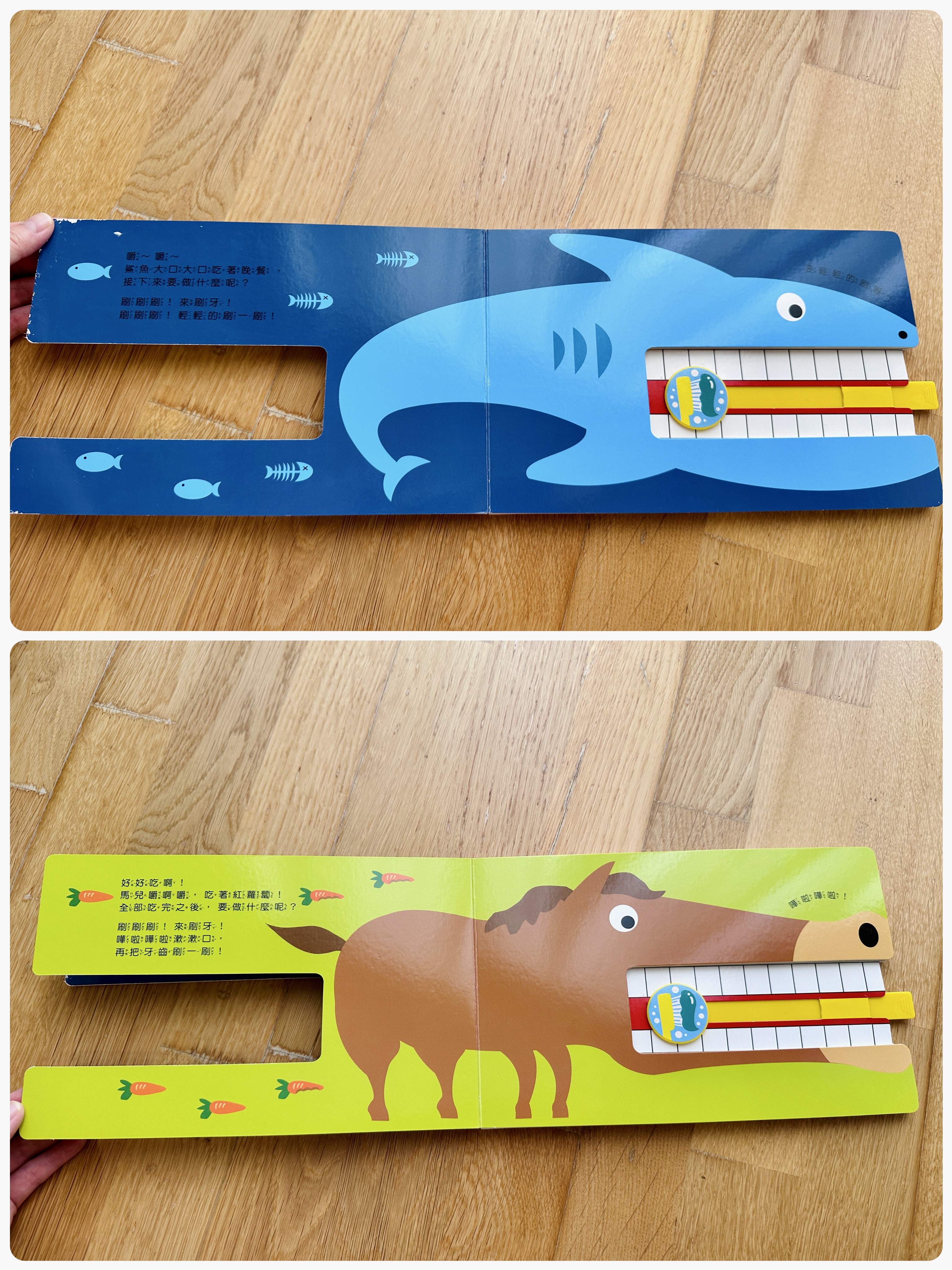 當所有動物吃完大餐後,一起動動小手拉拉拉幫動物們刷刷牙,仿刷牙抽拉設計,嘩啦嘩啦把牙刷乾淨啦▼