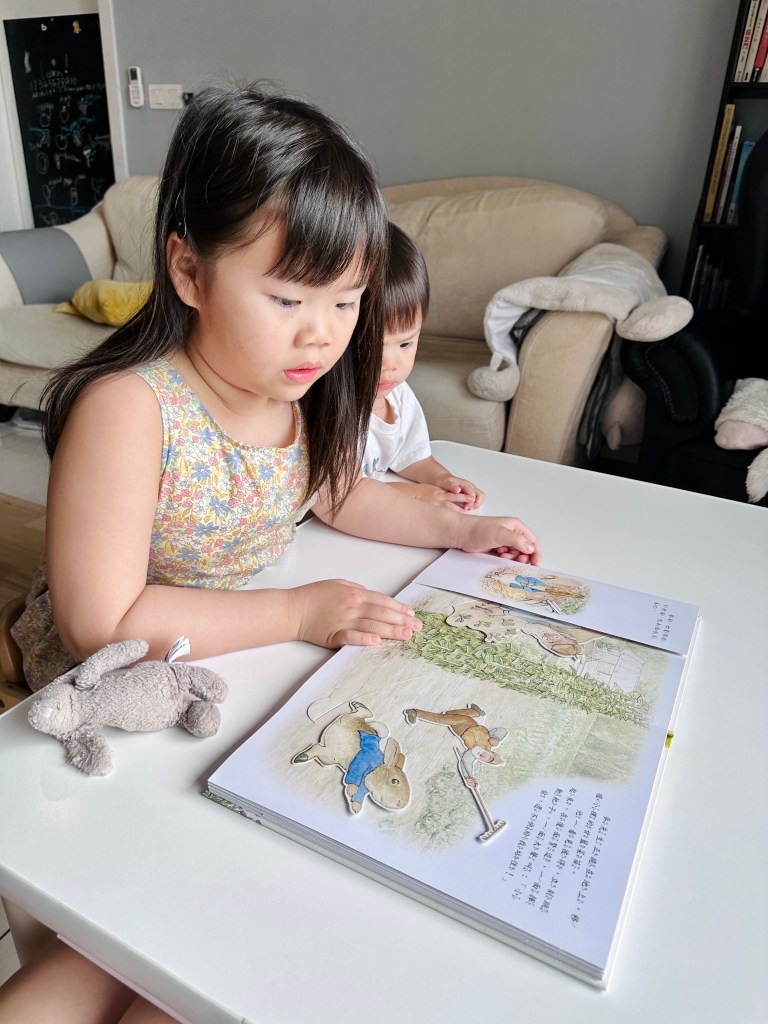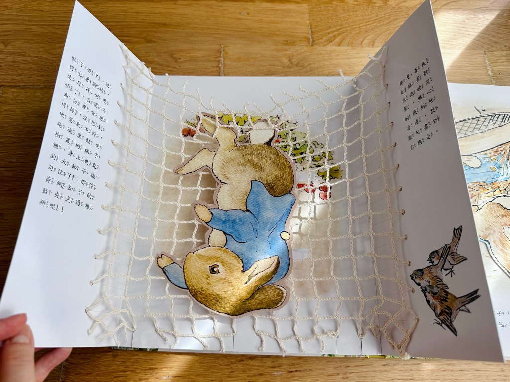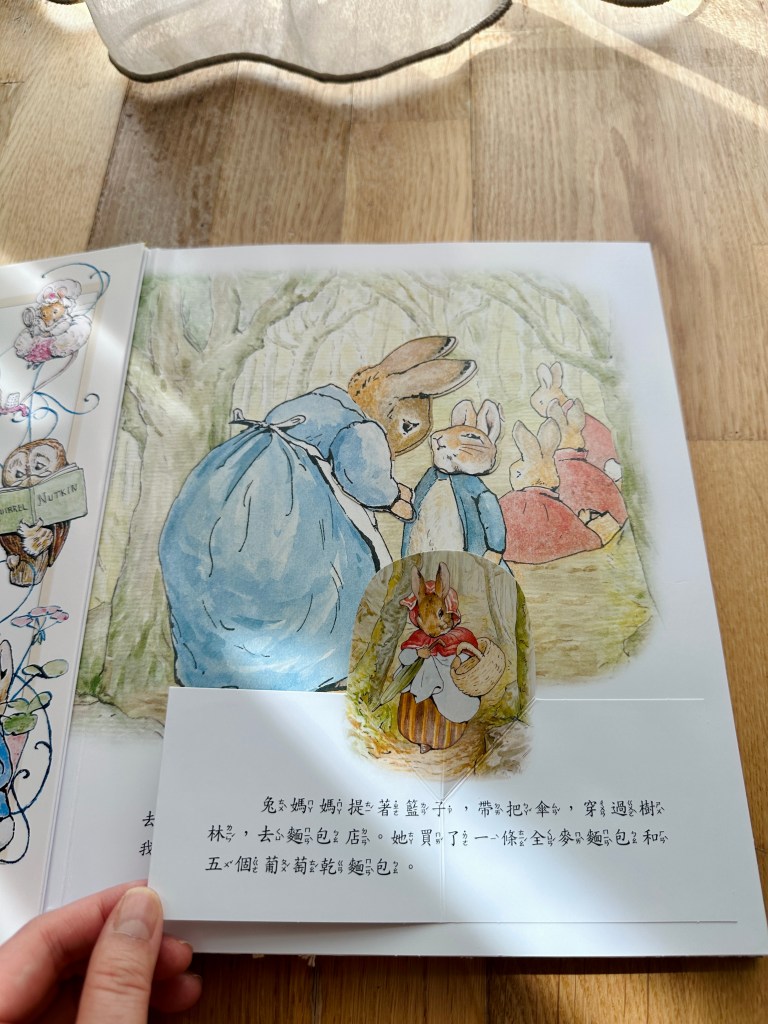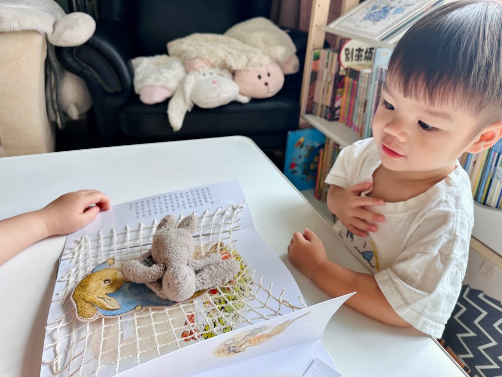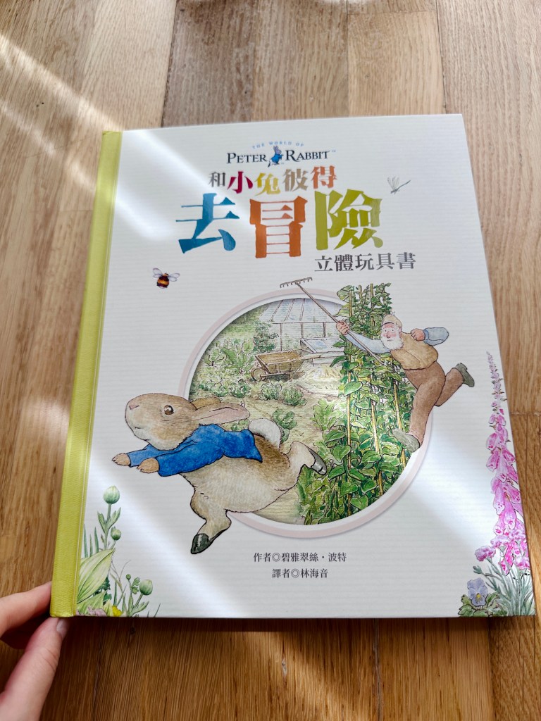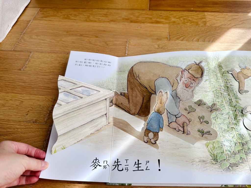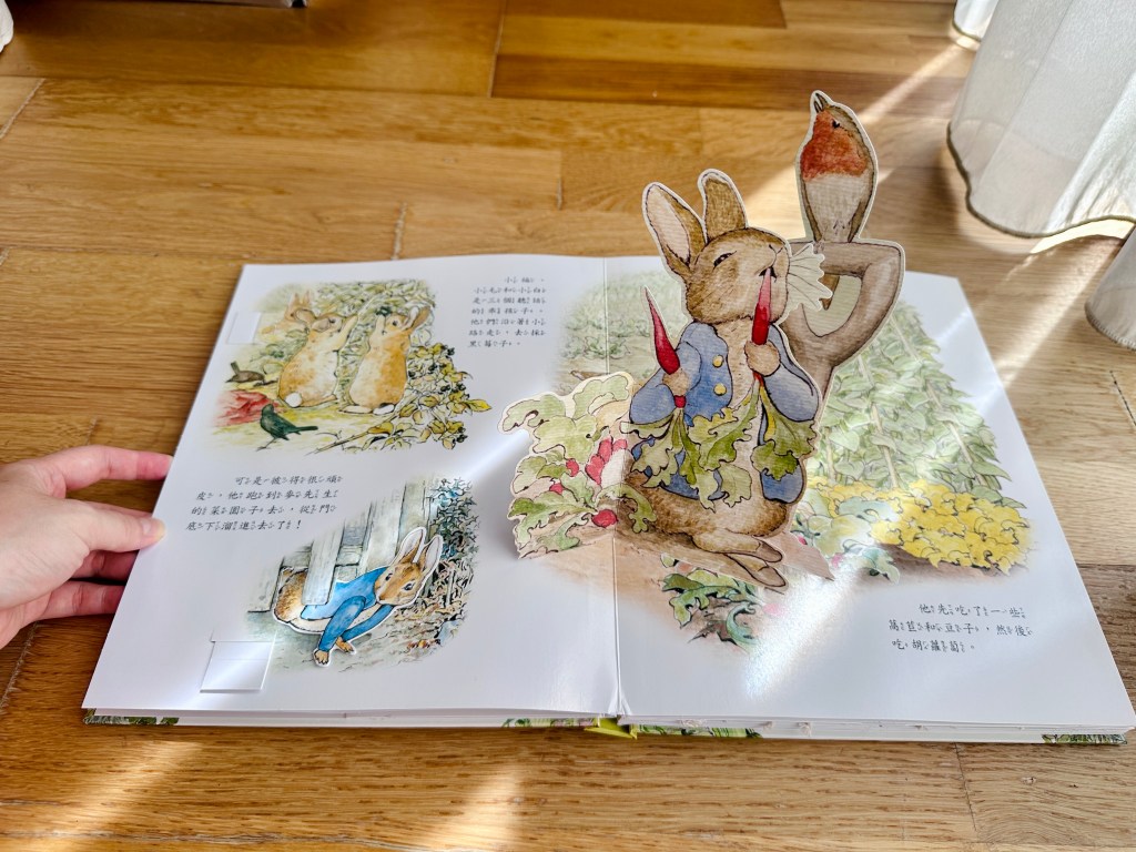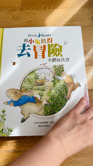 和小兔彼得去冒險是一本非常精緻的立體書,共讀時讓孩子親手操作,就像導演一樣,陪彼得冒險溜進菜園,再驚險逃脫,也可以加入腔調和音效,讓孩子學習如何講述一個生動有趣的故事。