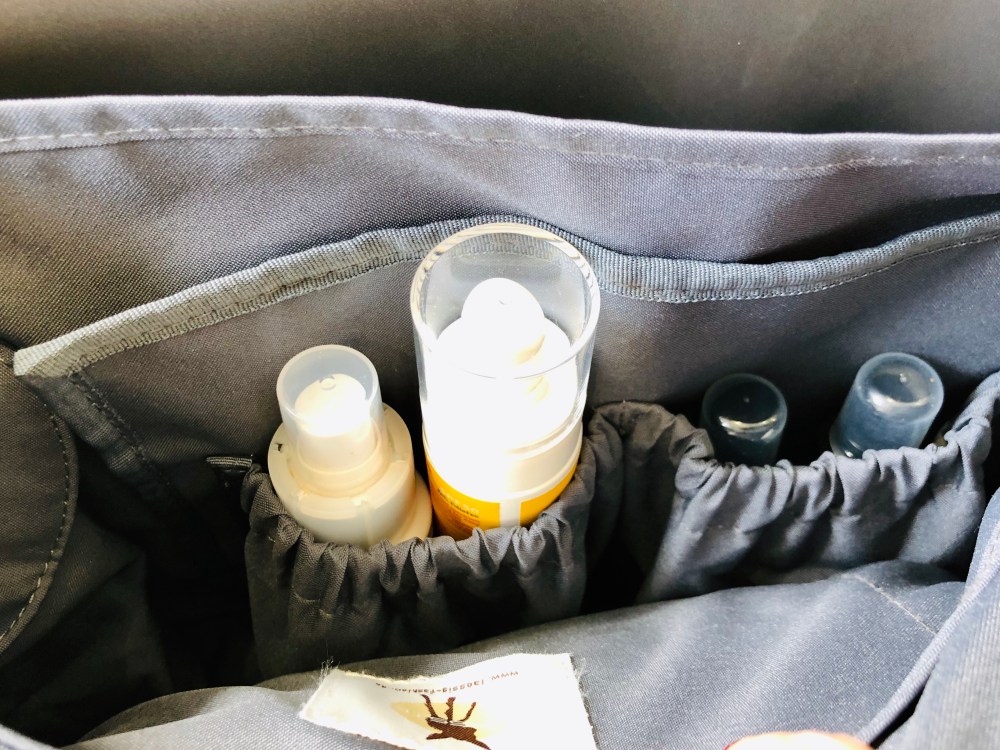 小妞現在都喝罐裝牛奶,奶瓶袋正好拿來插這些防蚊液消毒液之類的瓶瓶罐罐。