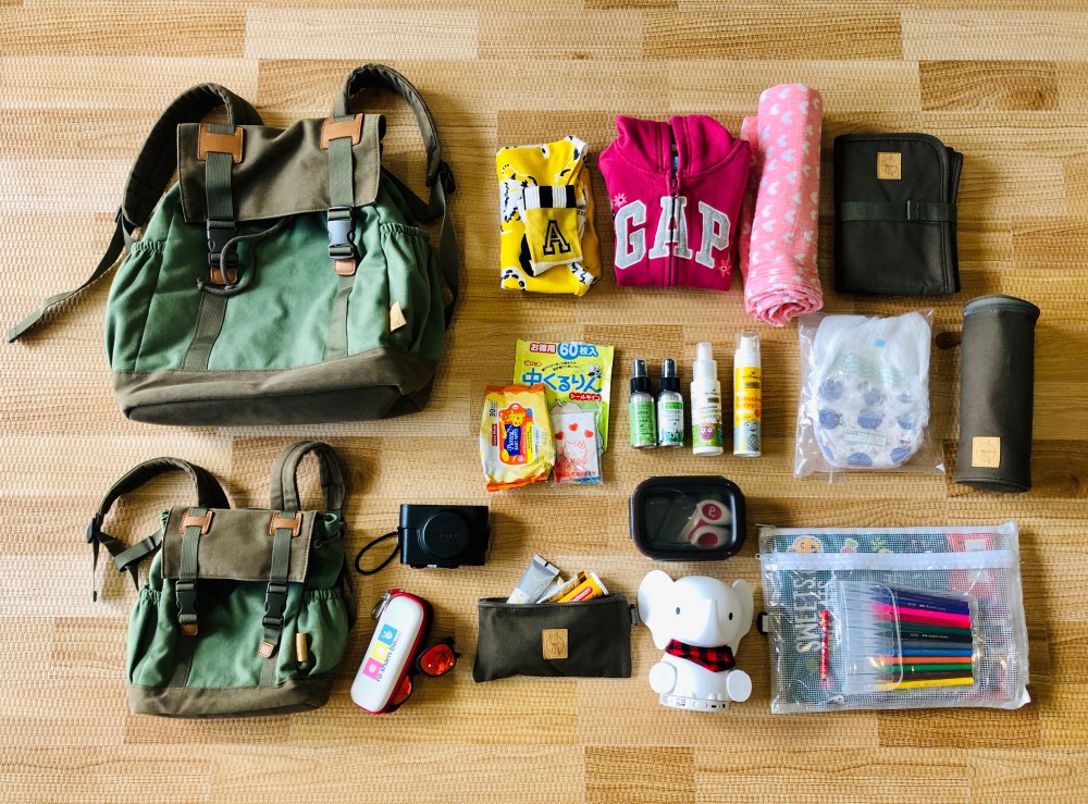 餐具水壺,路上玩的教具,消毒防曬防蚊簡單藥品,媽媽的錢包相機。