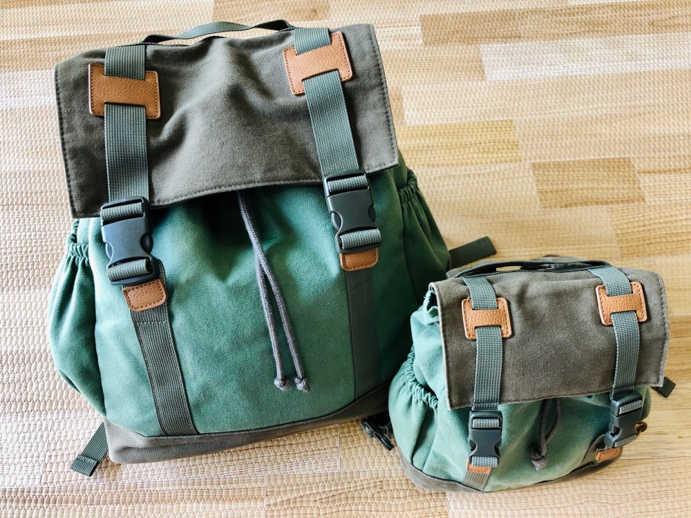 這個包款共有三種背袋,最短的皮革雙肩帶,綠色卡其雙肩帶,和斜背的卡其長肩帶,