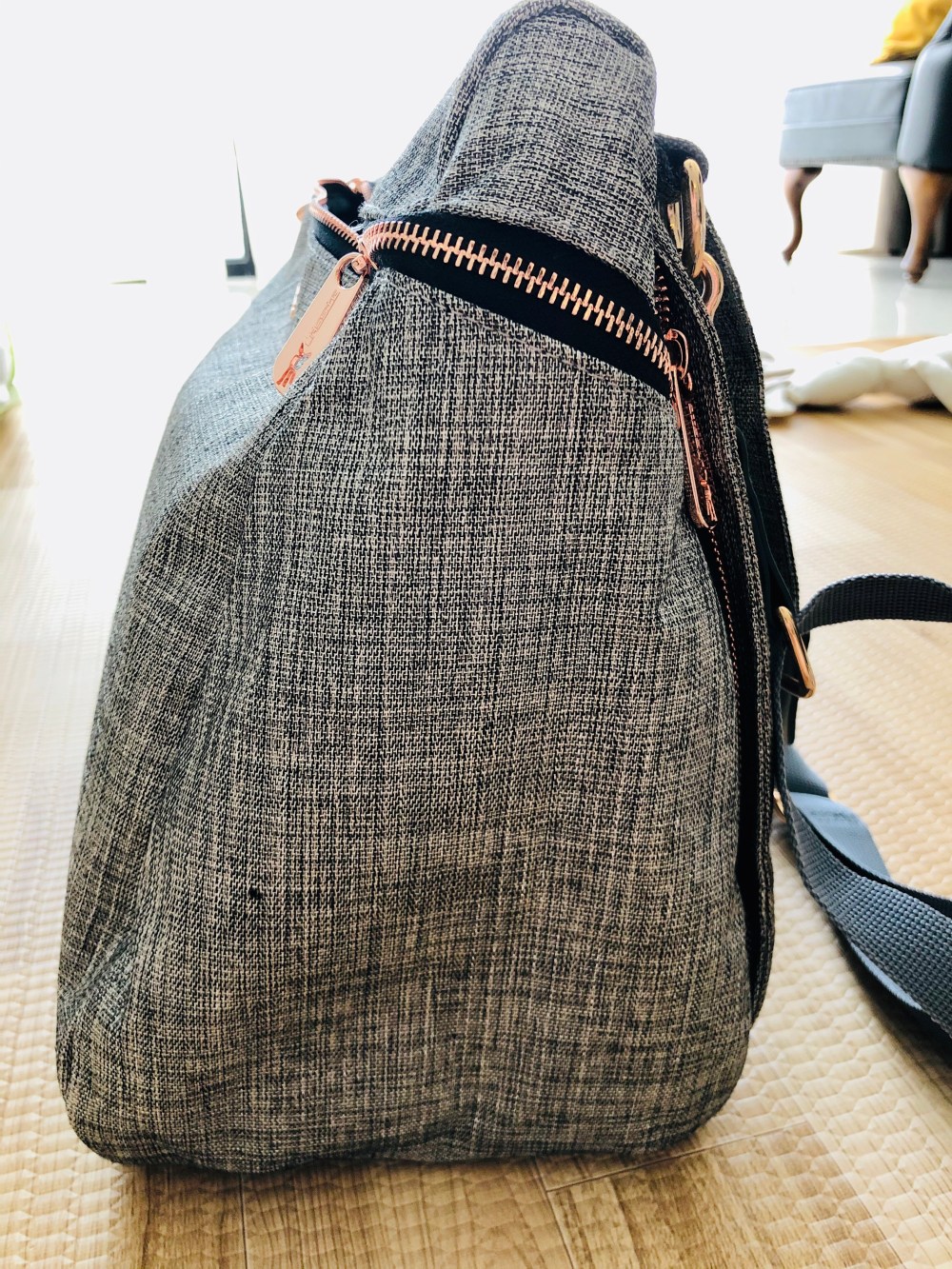 布料厚實,扣環是金屬所以重量稍微重一些,但比起普通這種尺寸的大包還是輕量很多。