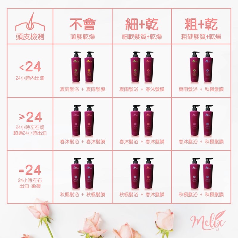 Melix替我量身挑選針對控油的Summer Rain夏雨洗髮露,搭配Autumn Breeze Conditioner 秋楓髮膜,再加茉莉茶樹抗屑噴霧,整套控油抗屑的完美組合就完成啦。