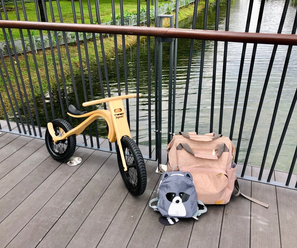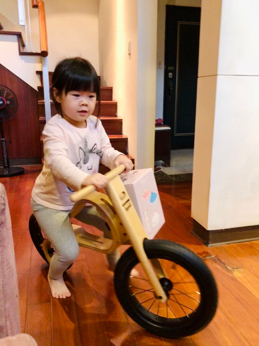 "除了GLOBBER滑板車,我們有一台新的台灣設計木頭平衡車,想不想先試試看?"