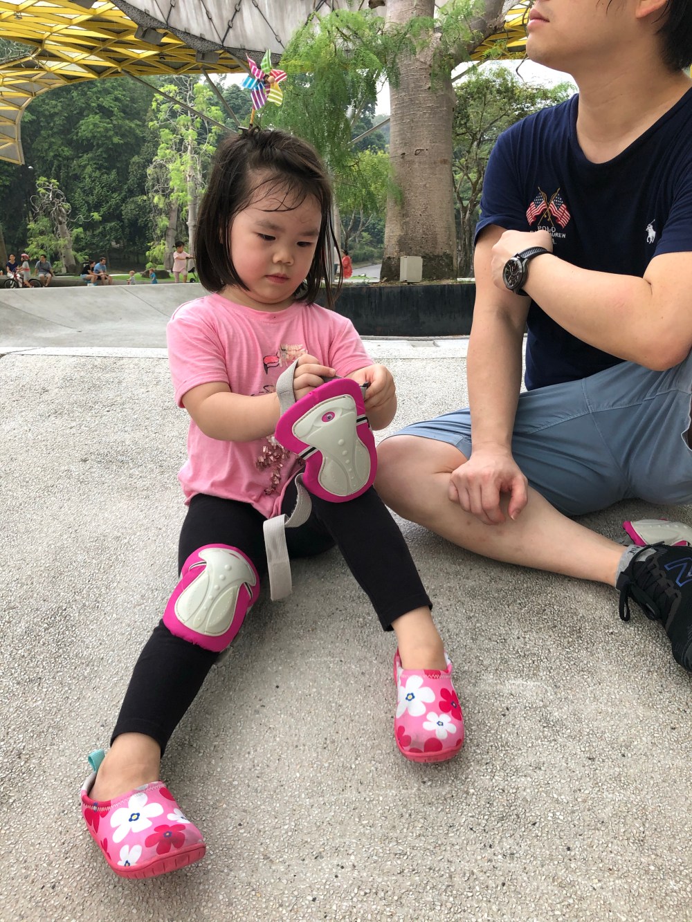 媽媽告訴她"如果想騎快就一定要綁上護具喔!"