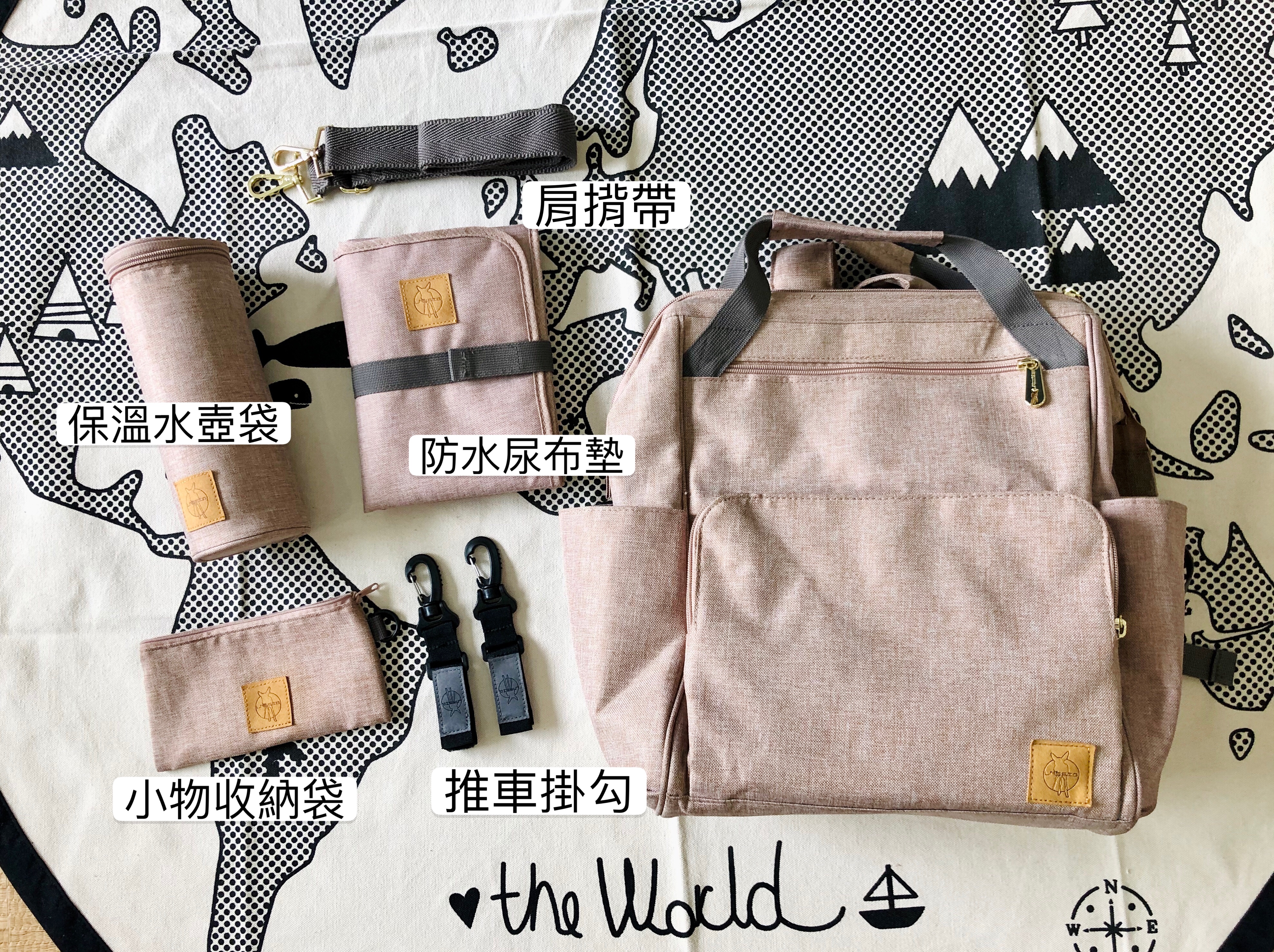 一樣附育兒配件:尿布墊,奶瓶保溫袋,小物收納袋,側背帶及防偷竊推車掛勾組 。