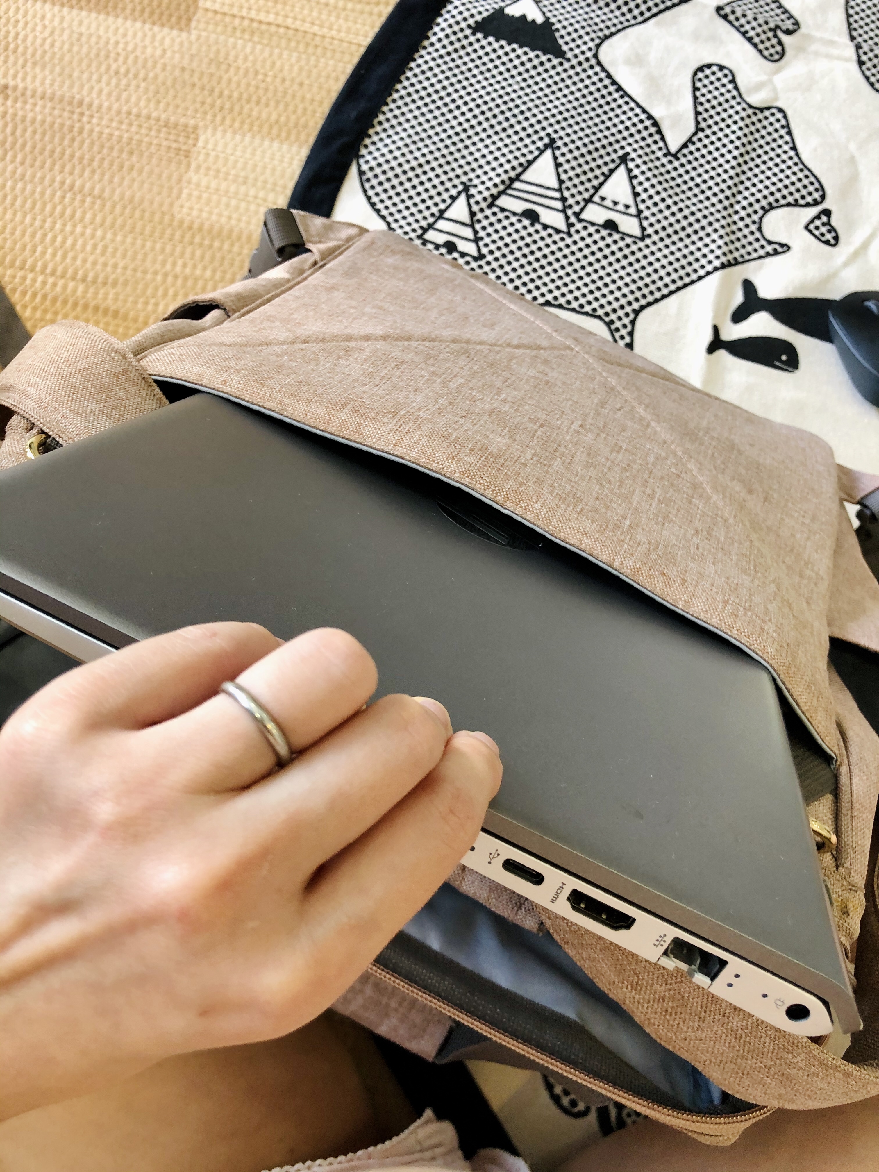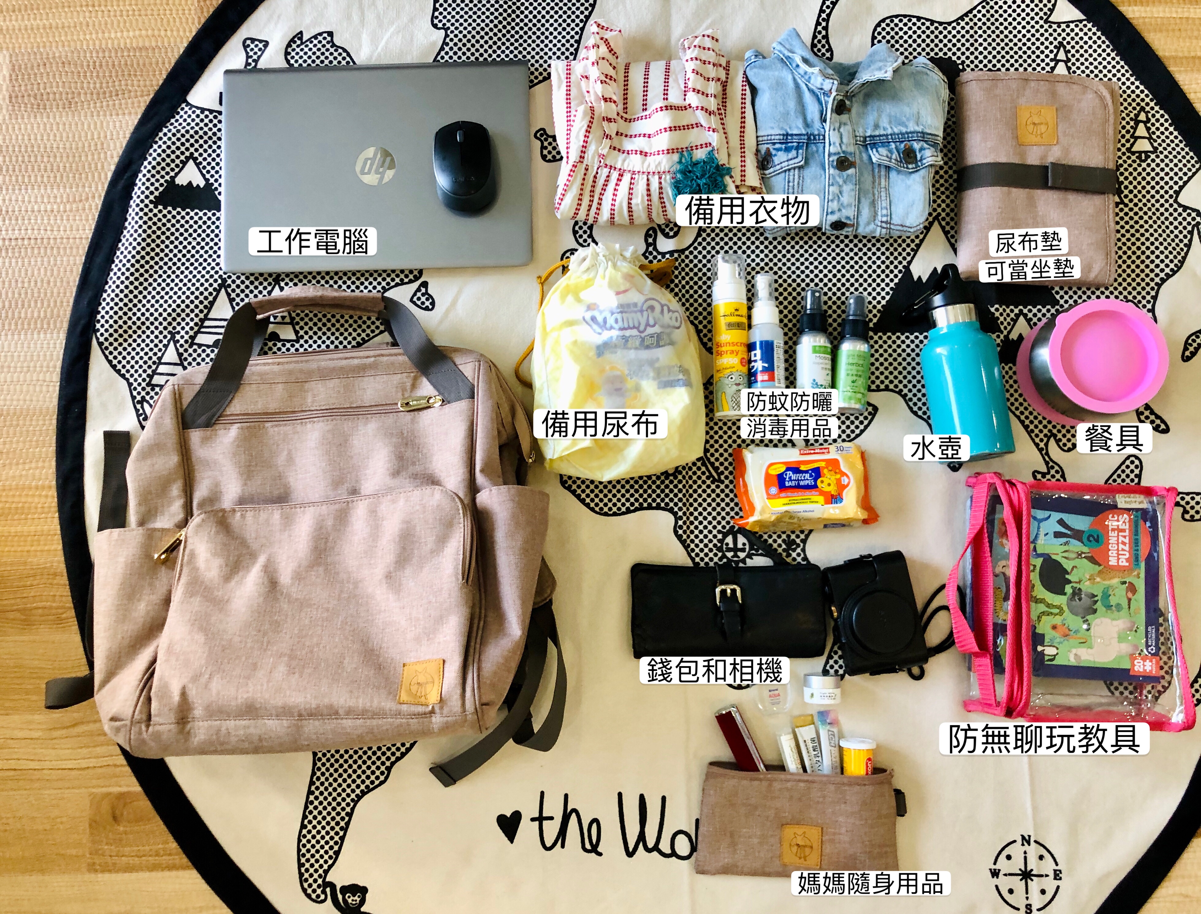 外出工作我最常帶這款,換洗衣服,小蓋毯,備用尿布,餐具水壺,玩的教具,消毒防曬防蚊簡單藥品,媽媽的錢包相機和電腦。