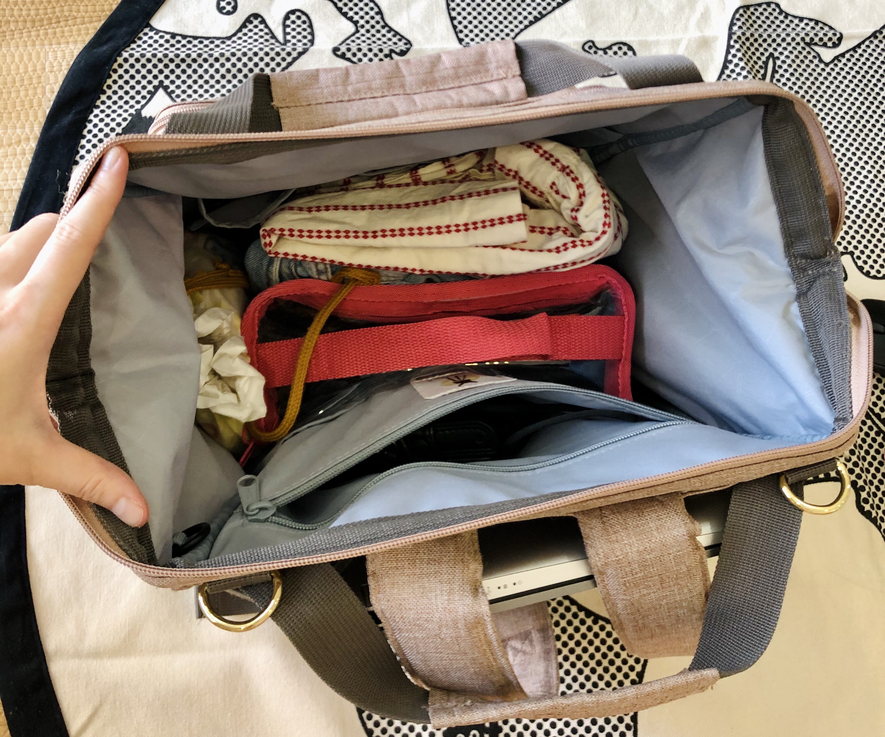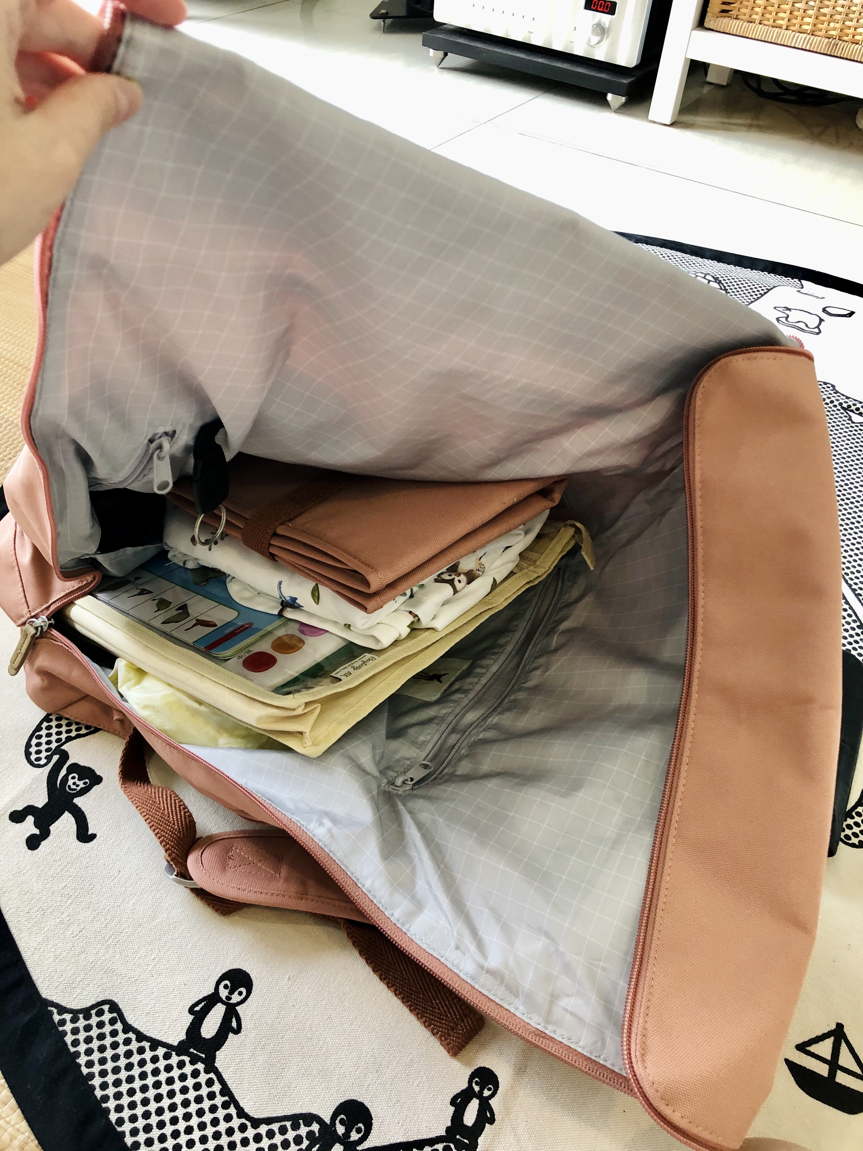 內部收納空間最多,換洗衣服,小蓋毯,備用尿布,餐具水壺,路上讀的讀的雜誌A4大小雜誌,消毒防曬防蚊簡單藥品,媽媽的錢包相機。