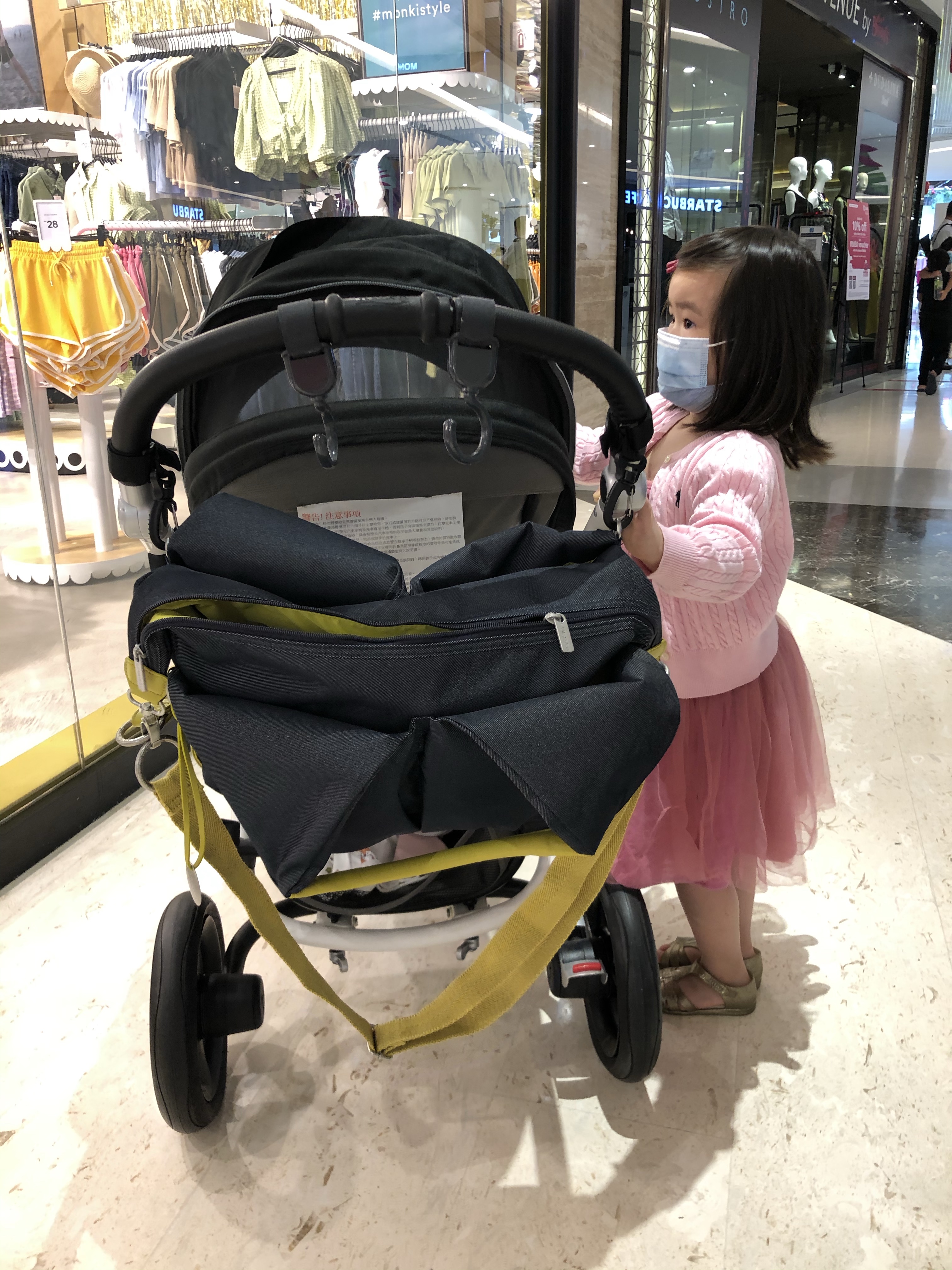 附有育兒配件:尿布墊,奶瓶保溫袋,小物收納袋及防偷竊推車掛勾組。