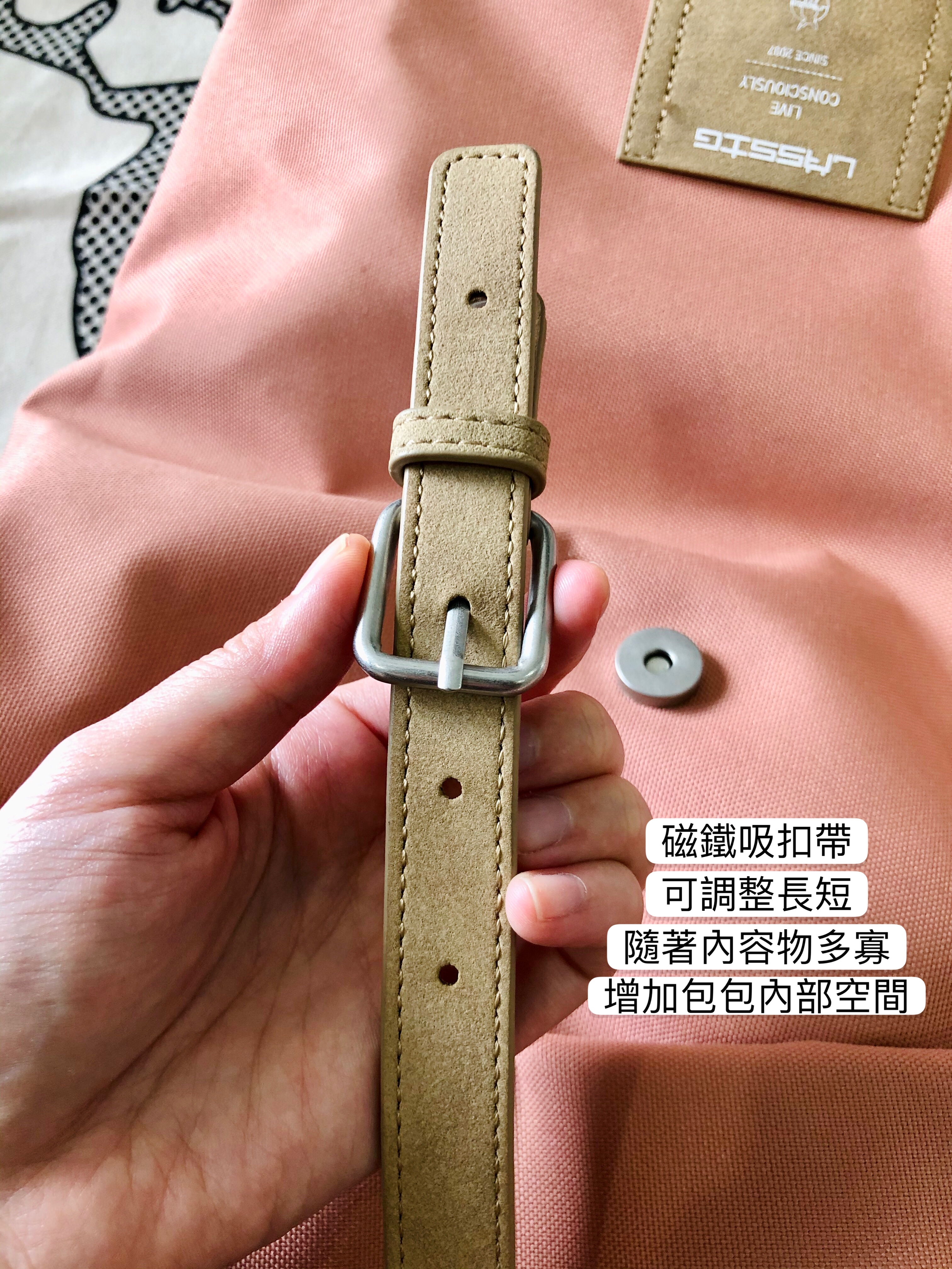 磁吸扣帶有調節孔洞,可隨內容物多少調整,增加包包空間。