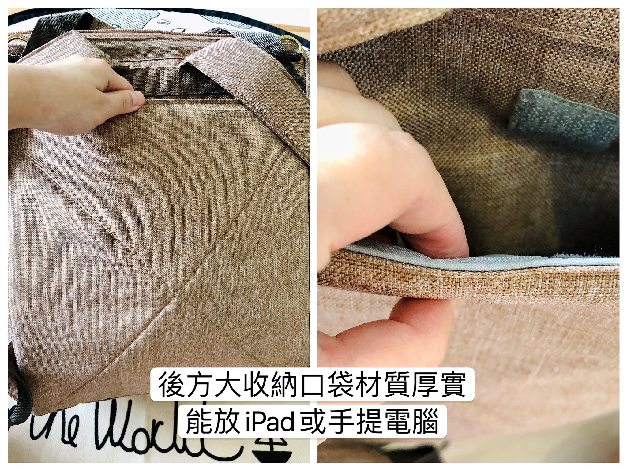 後側大收納袋非常厚實,可裝入IPAD或13吋筆電,提供良好保護。
