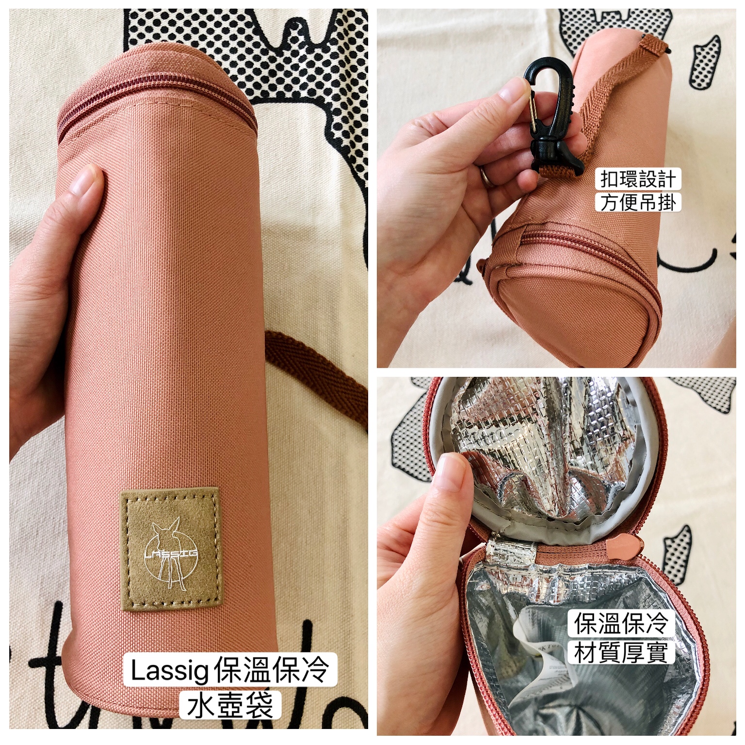 每個配件都很細緻,水壺袋厚實保溫還有扣環,方便吊掛在包包或推車上。