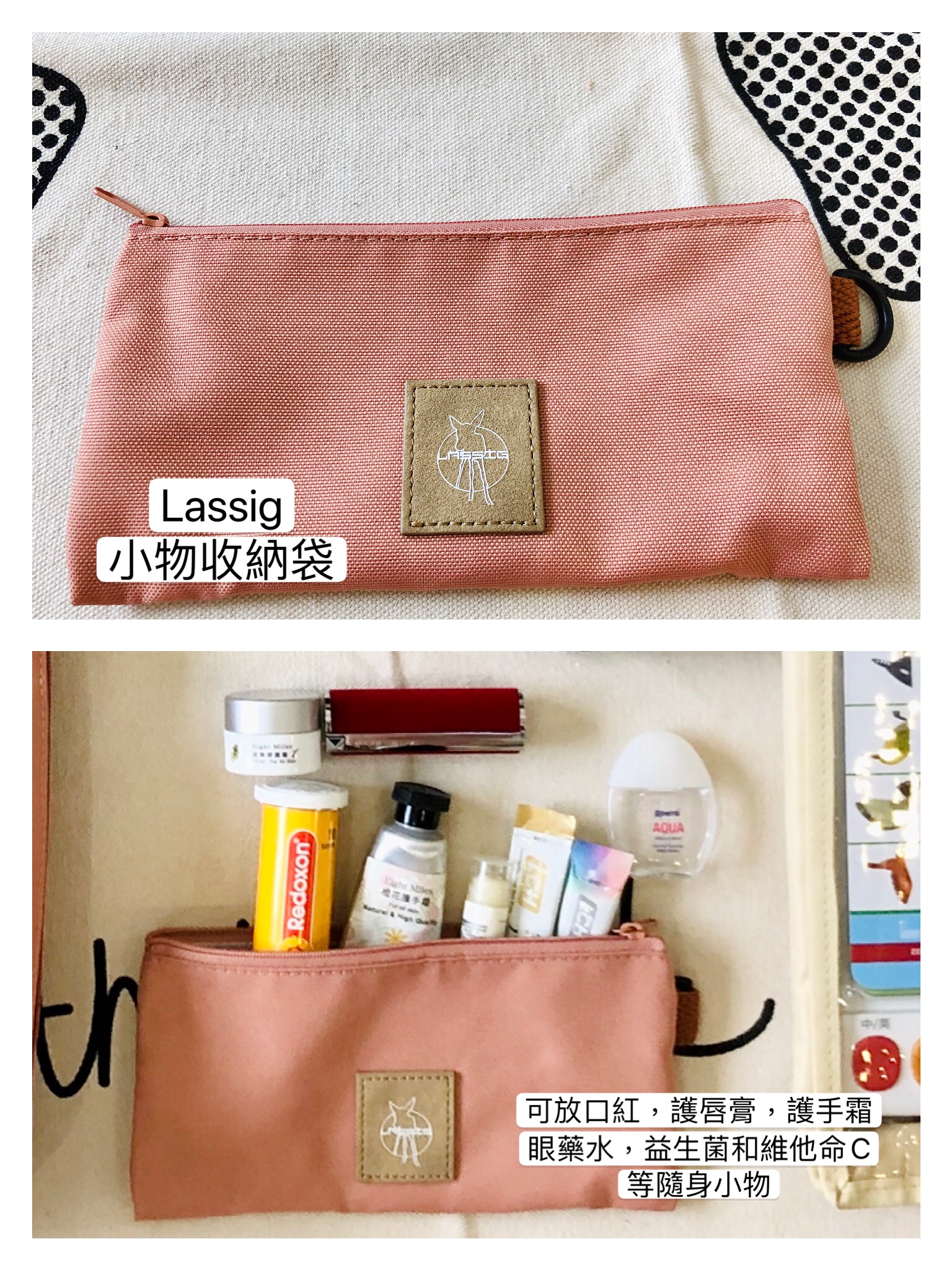 小物收納袋,我都拿來裝一些外出的小小瓶瓶罐罐,如果出遠門也會帶益生菌和維他命,還有媽媽的口紅和護手霜也別忘記啦!