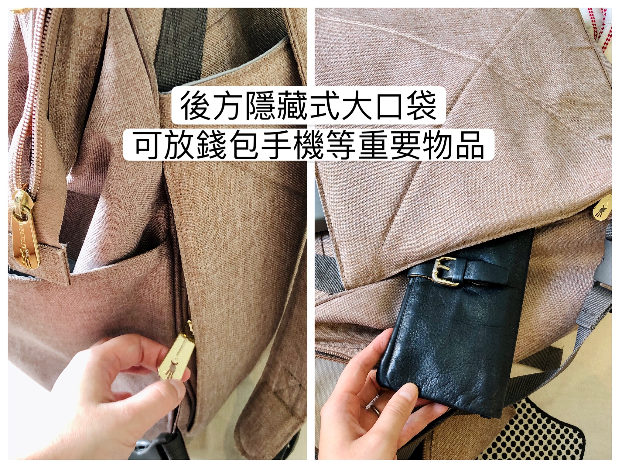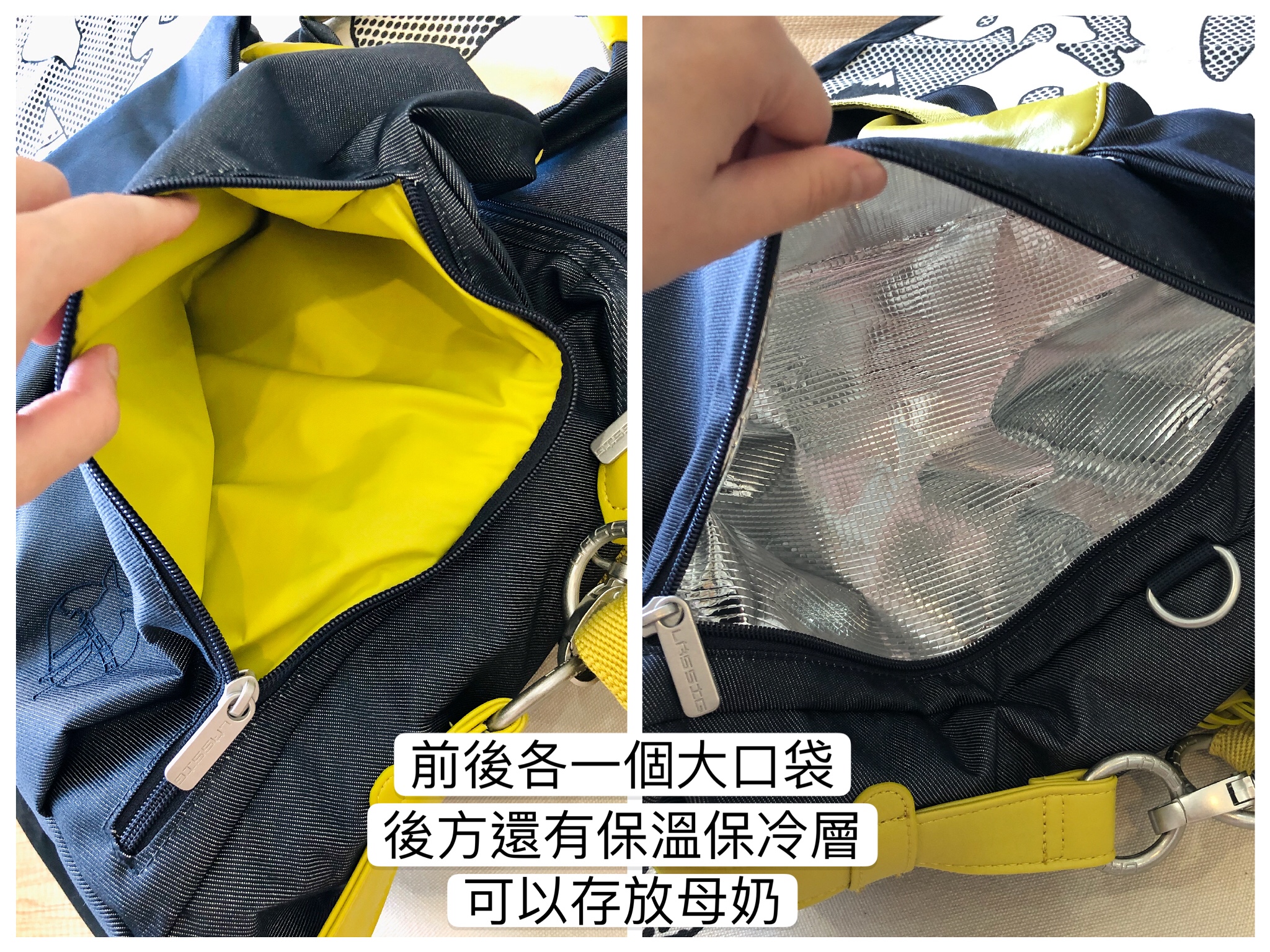前後各一個大口袋,後方的有保溫保冷功能,放入小冰寶收藏母奶或外出食物也沒問題。