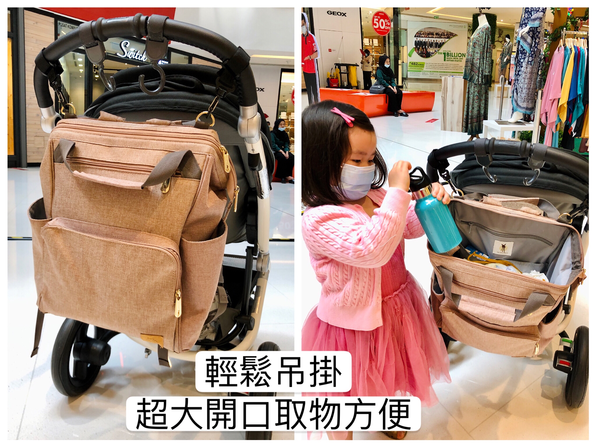 非常實用的推車掛環,魔鬼氈設計不挑車款,能把包包吊掛在推車上方便取物。