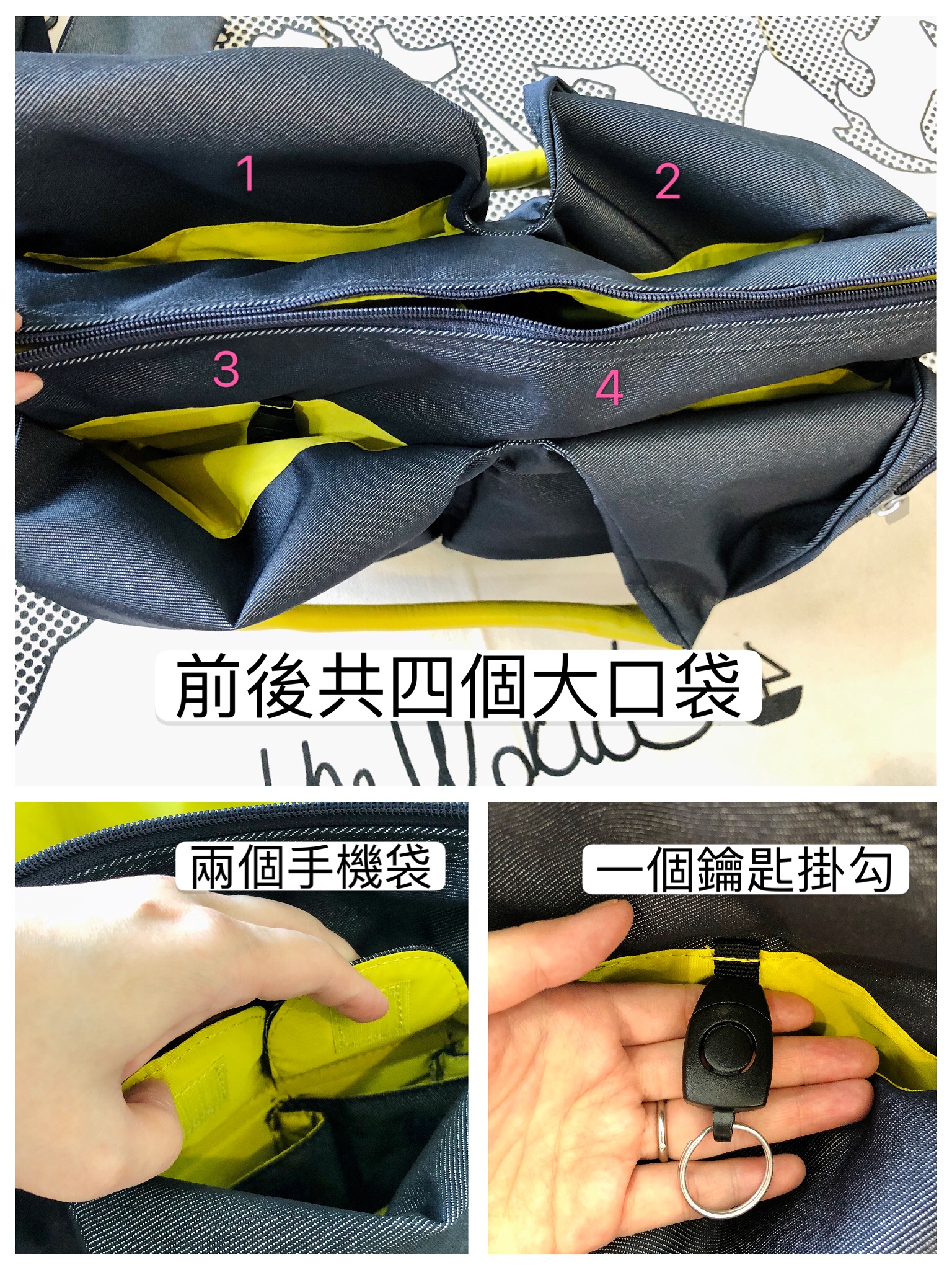 這四個口袋很好裝,立體設計水壺都能放,手機有帶蓋的專門收納袋,鑰匙也能掛上固定方便取用,悠遊卡和公司卡這些常用的小物通通都能放進去唷。
