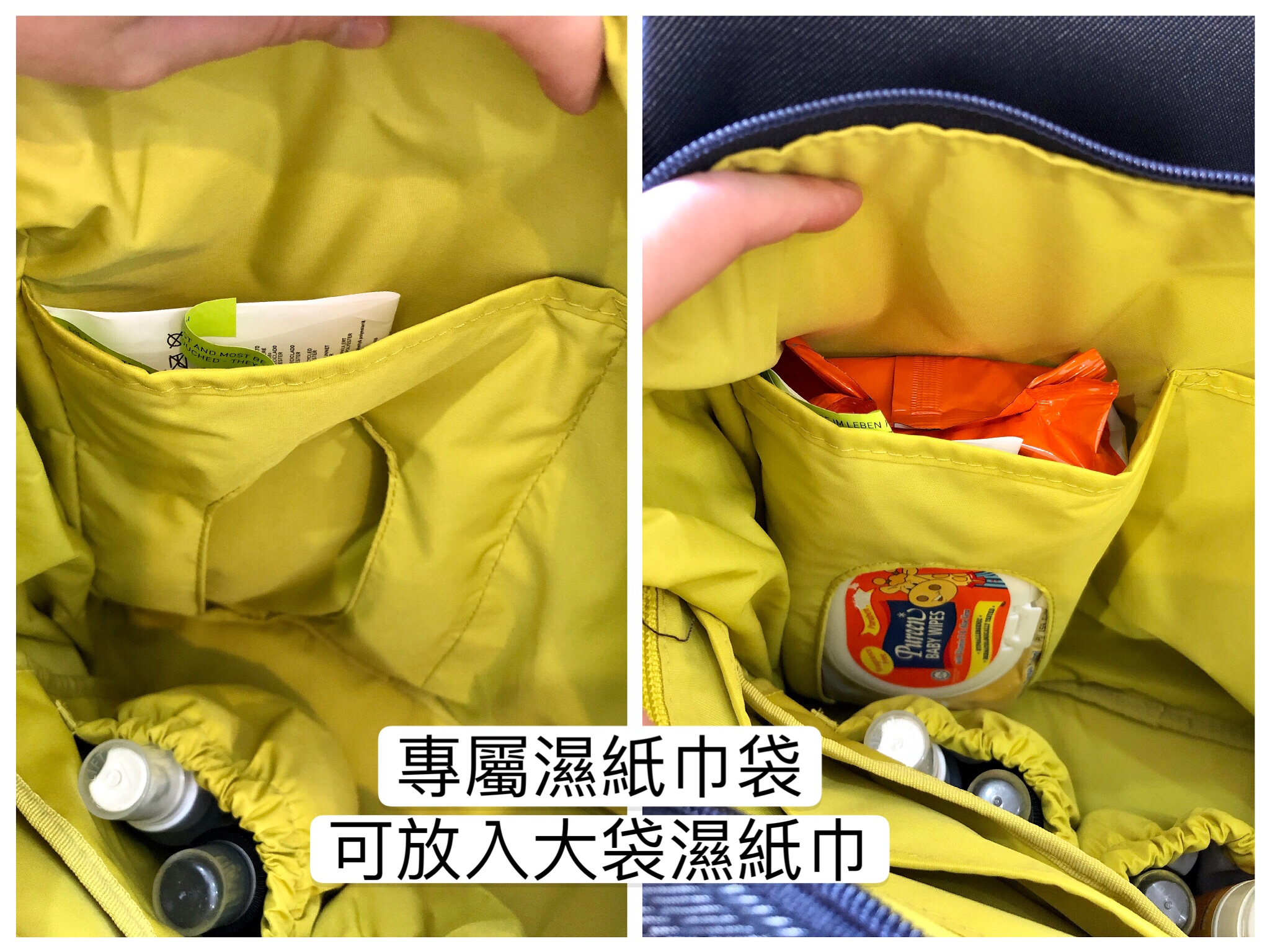 這款還特別有一個濕紙巾收納格,可以完整放入大包濕紙巾方便隨時抽取。