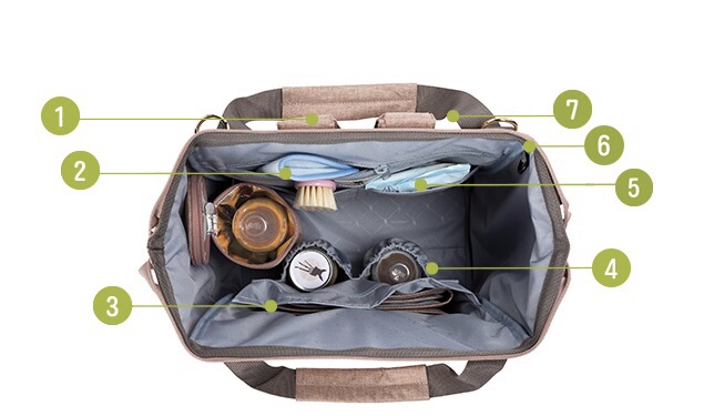 使用無汙染性材質,愛地球無負擔。獨特剪裁設計,內容量寬敞隔層分明,掛勾設計可輕鬆將包包掛置於推車上,為兼具休閒、時尚與功能性的包款。