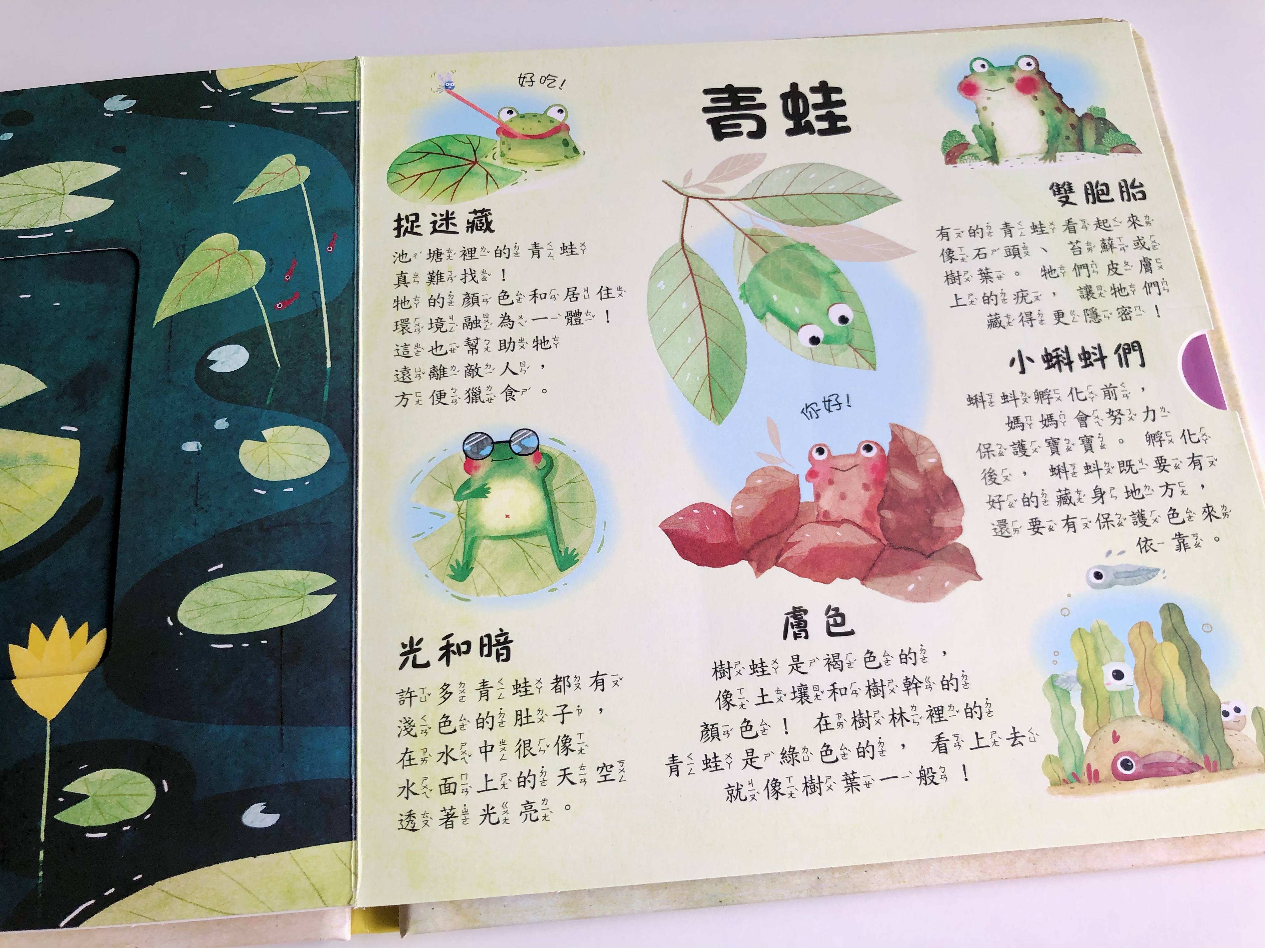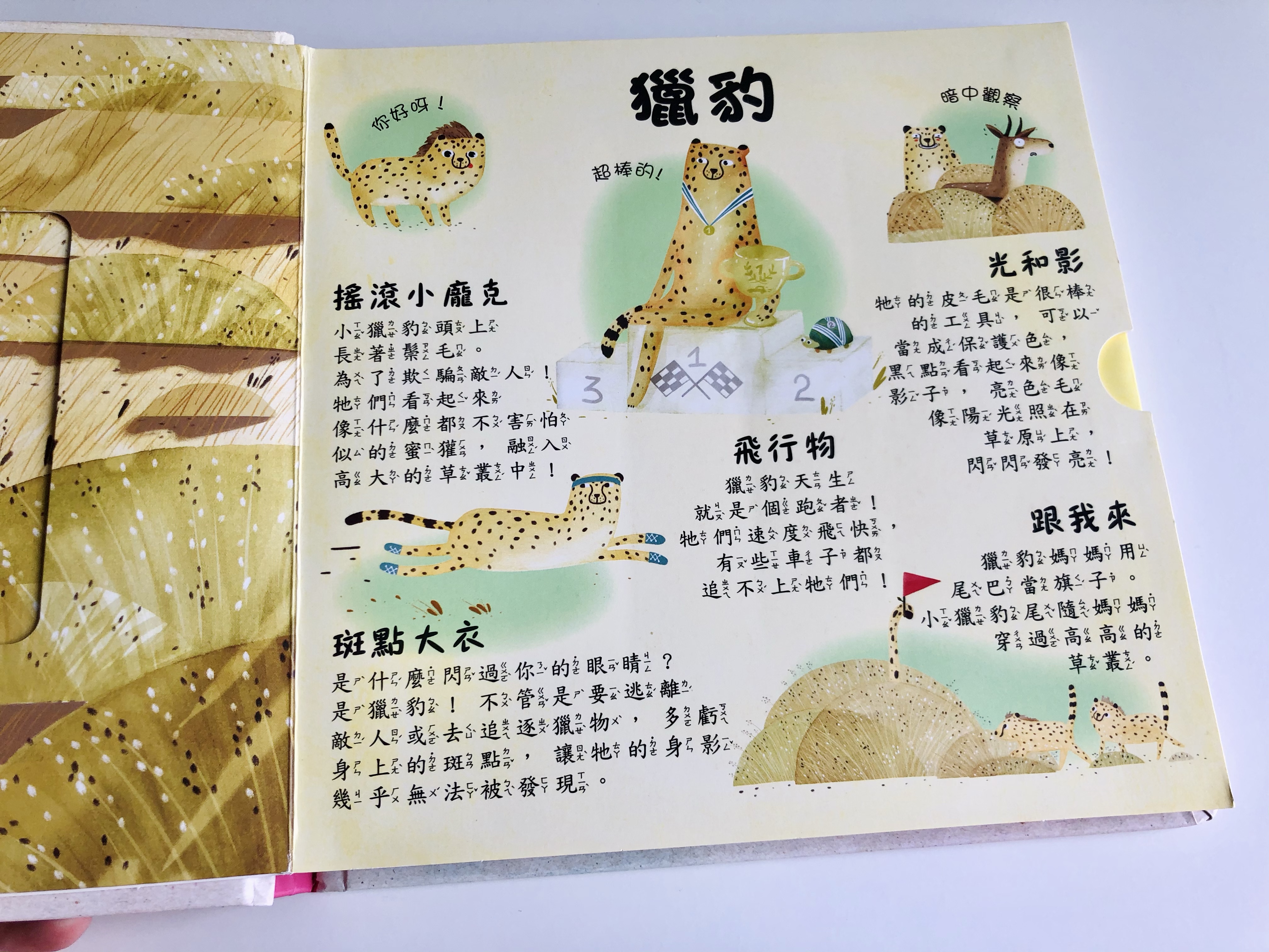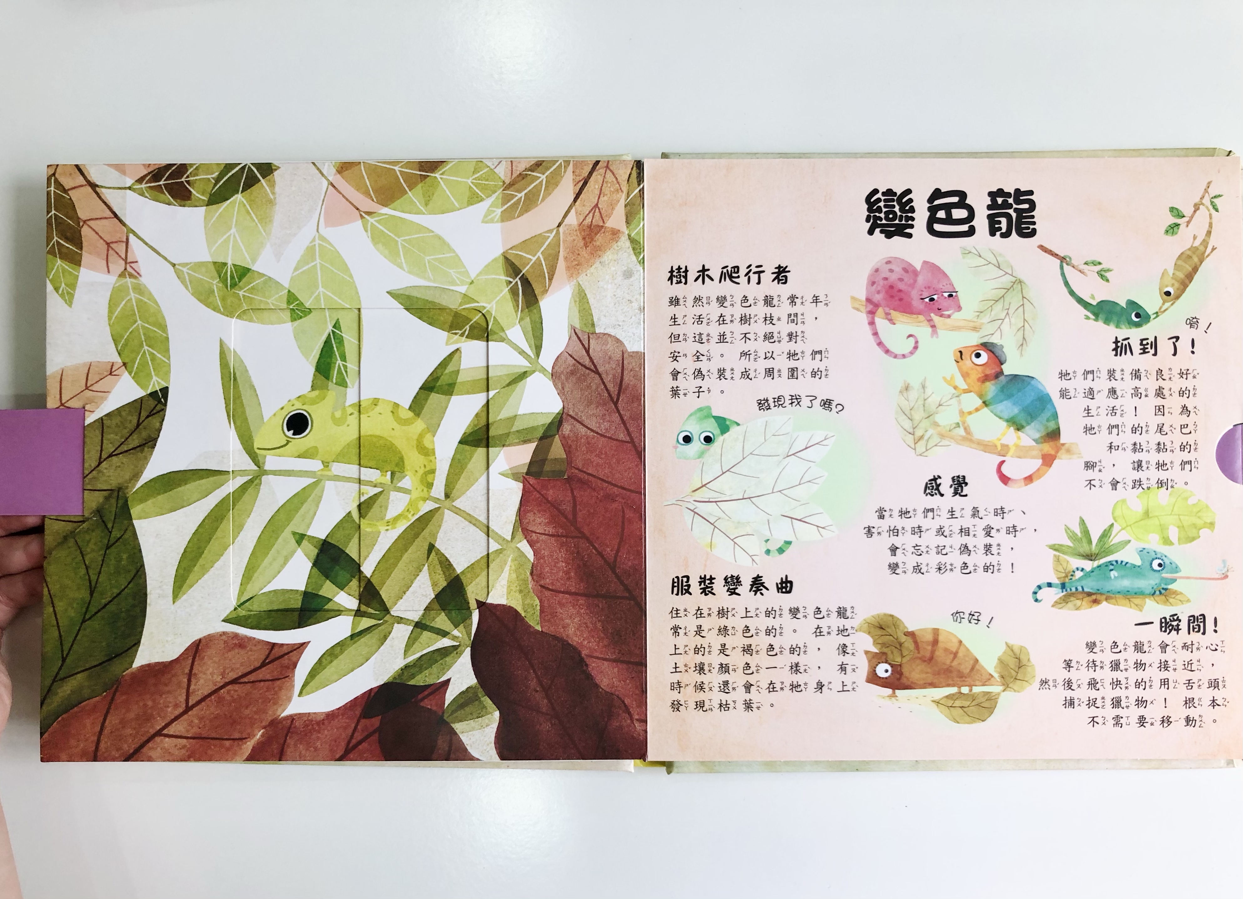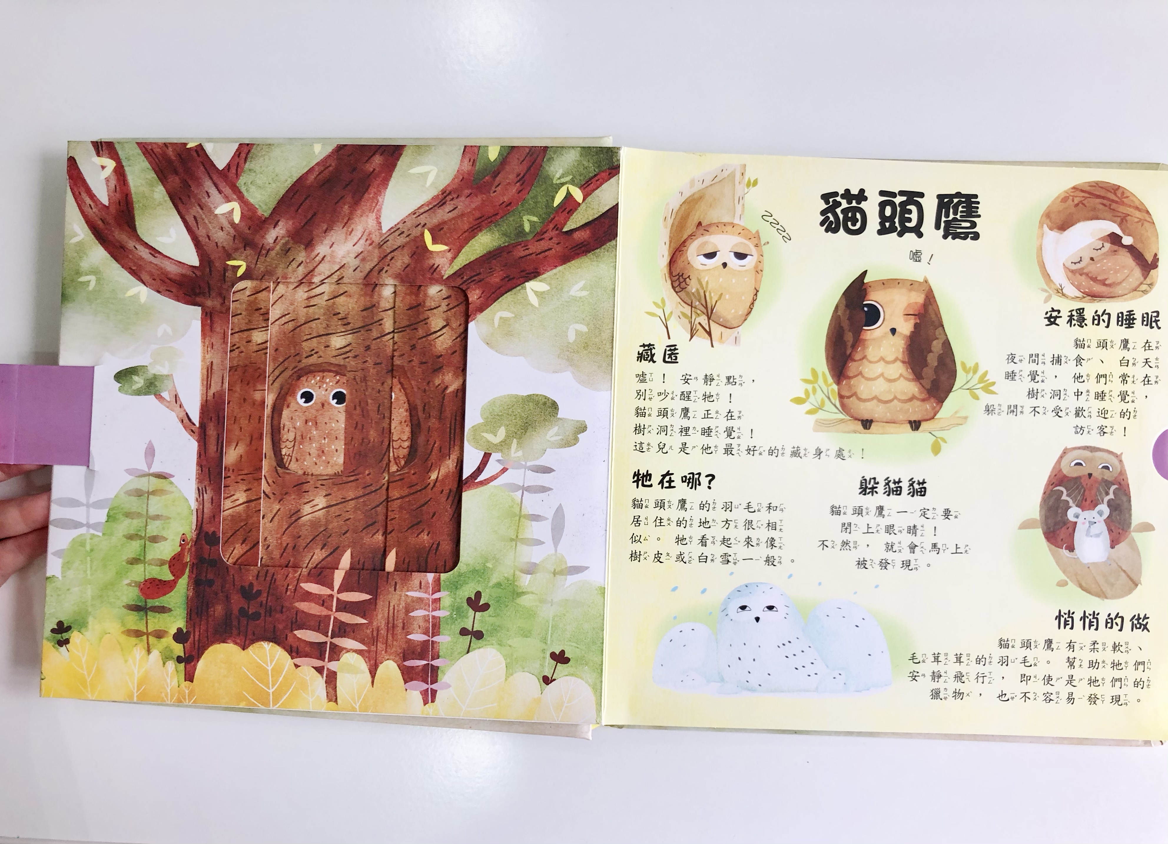 右邊描繪動物特性特徵,左邊是抽拉設計,小手拉一拉就能看到躲藏的小動物。