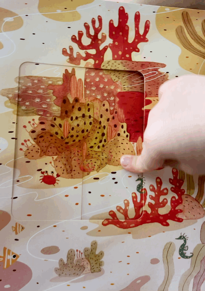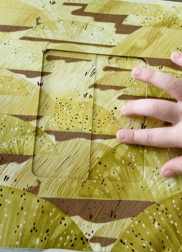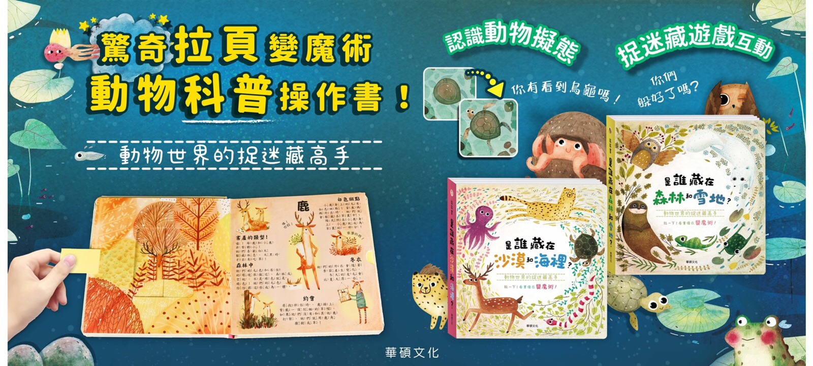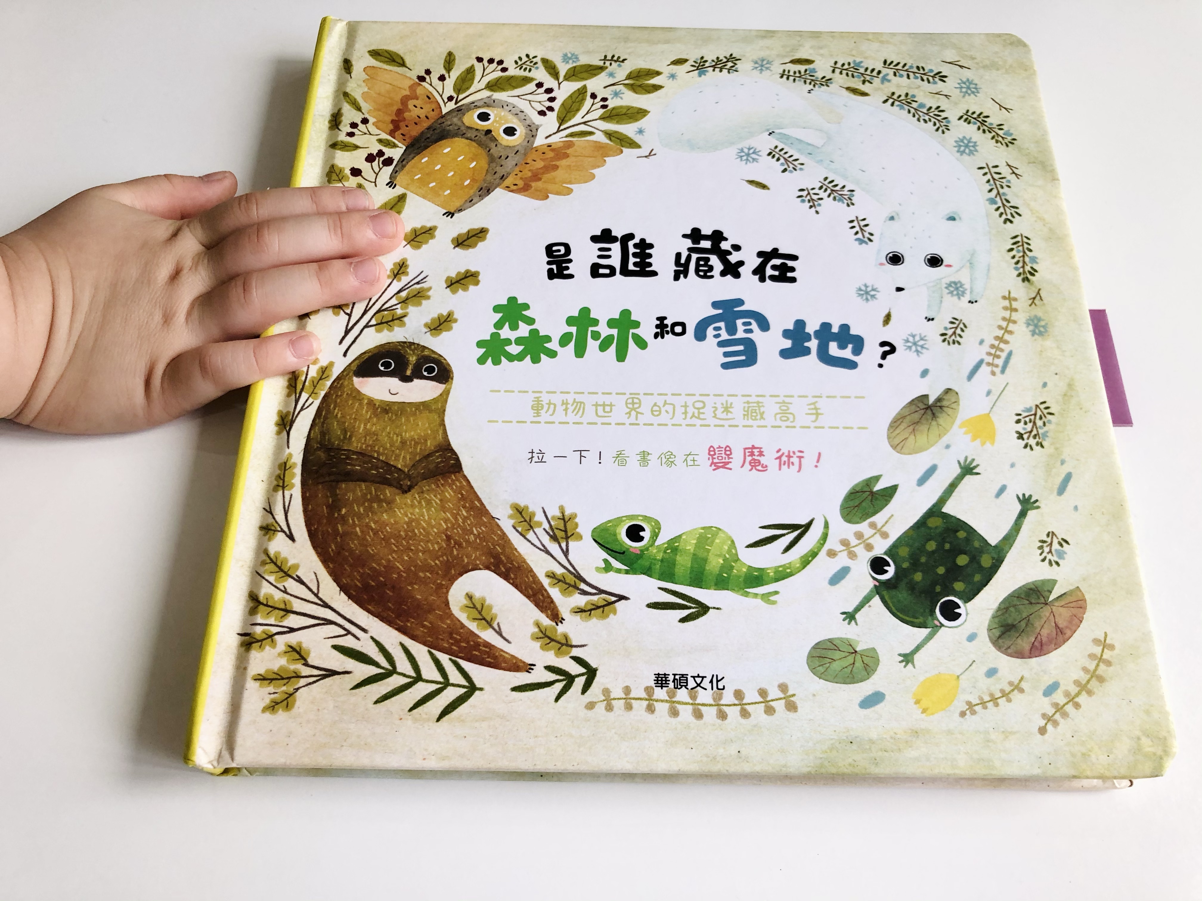 右邊描繪動物特性特徵,左邊是抽拉設計,小手拉一拉就能看到躲藏的小動物。