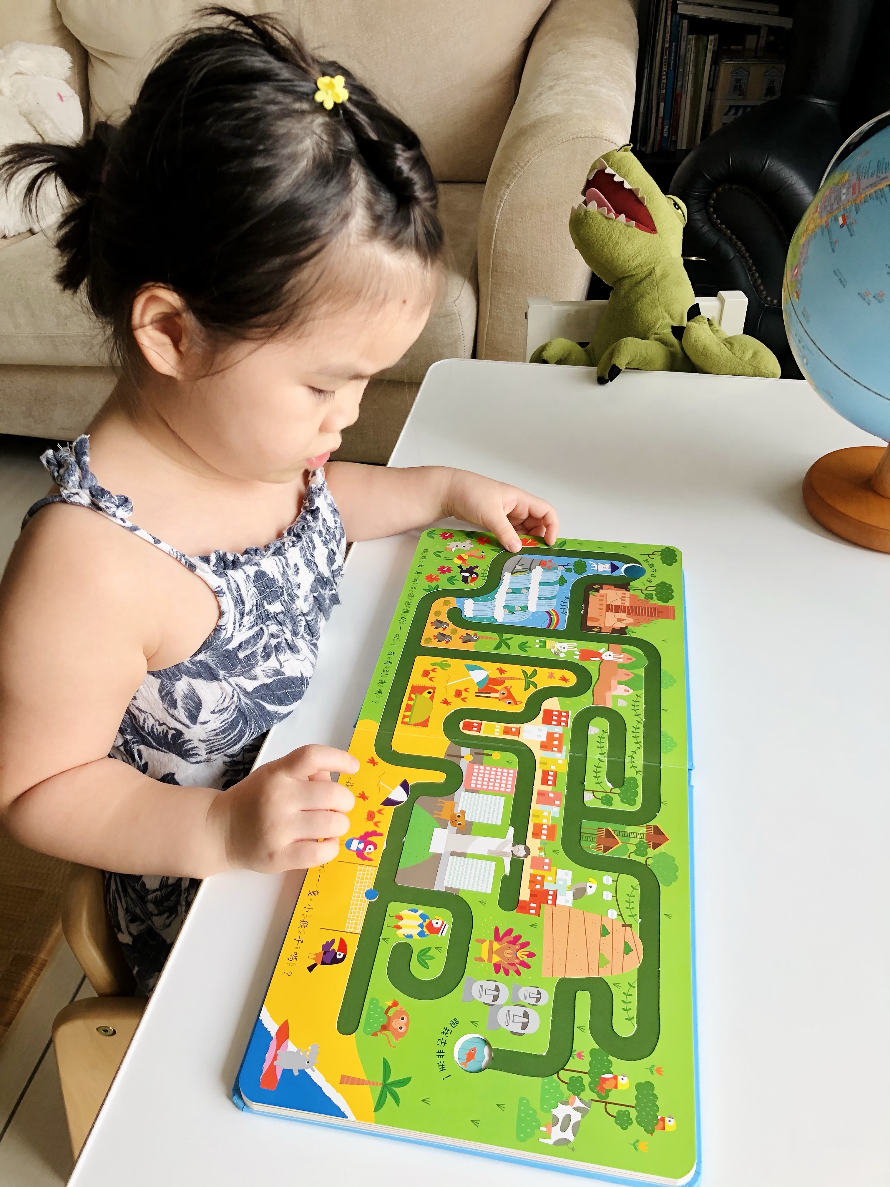 不用握筆,讓孩子用小手指去走迷宮,跟著書本一起到世界各地探險。