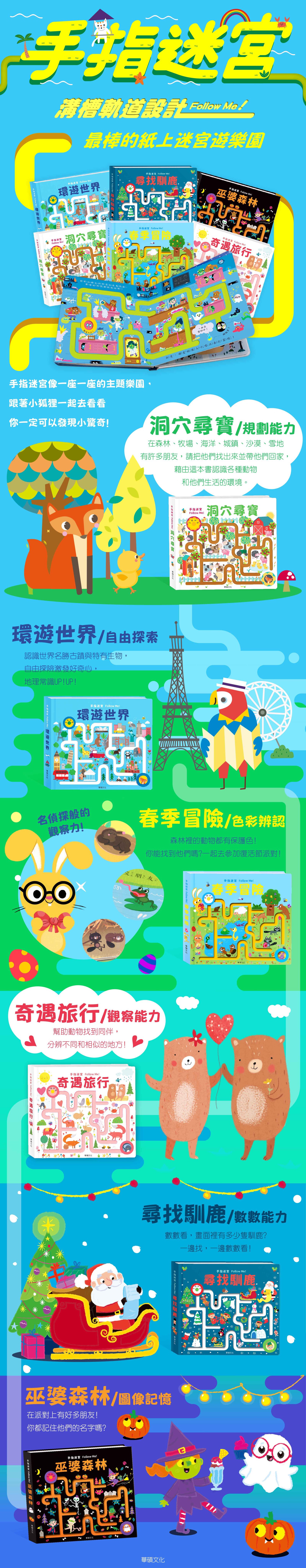 「手指迷宮遊戲書」目前一共有六本,內容從冒險到節慶,每本手指迷宮都有獨特的主題。