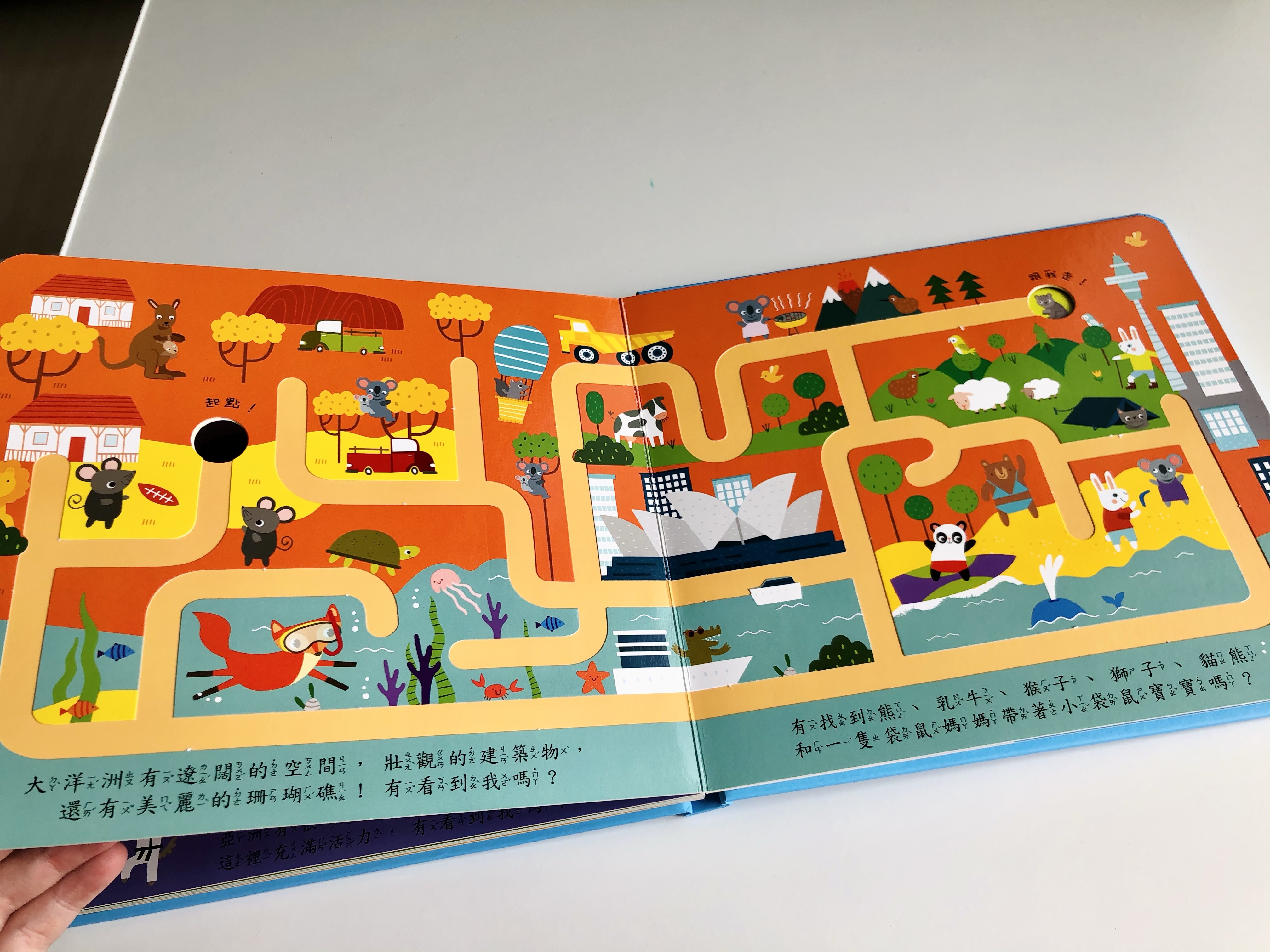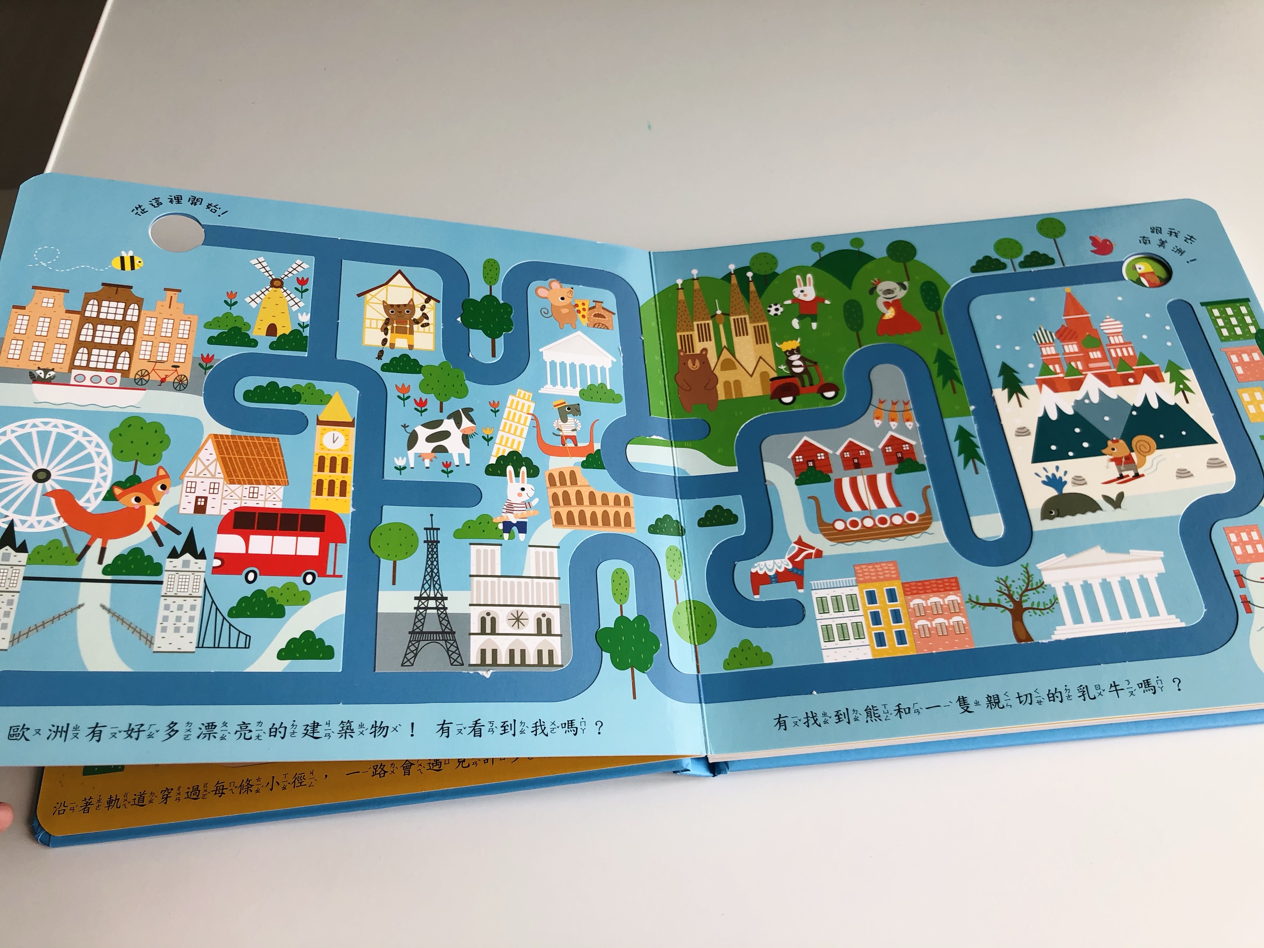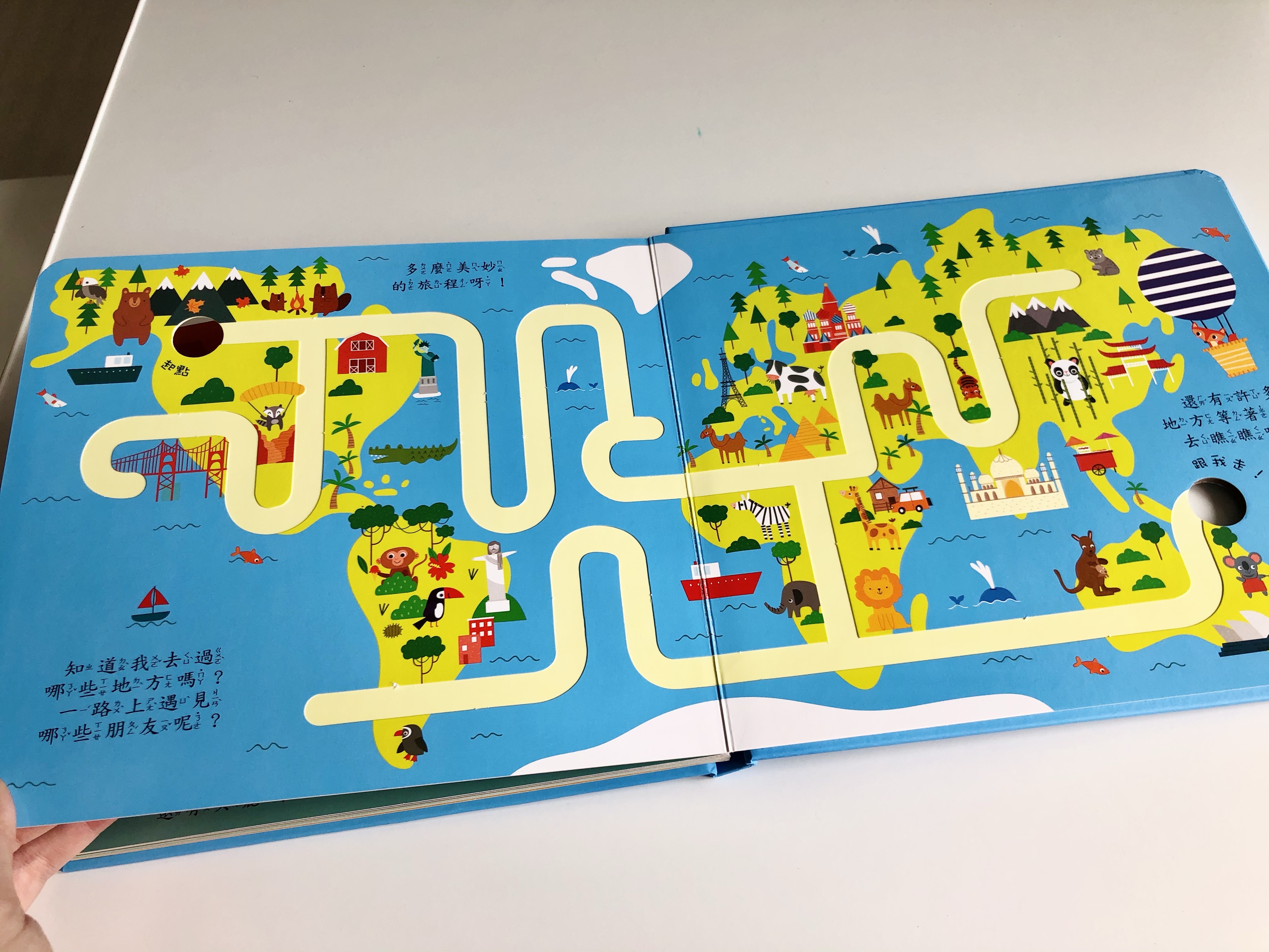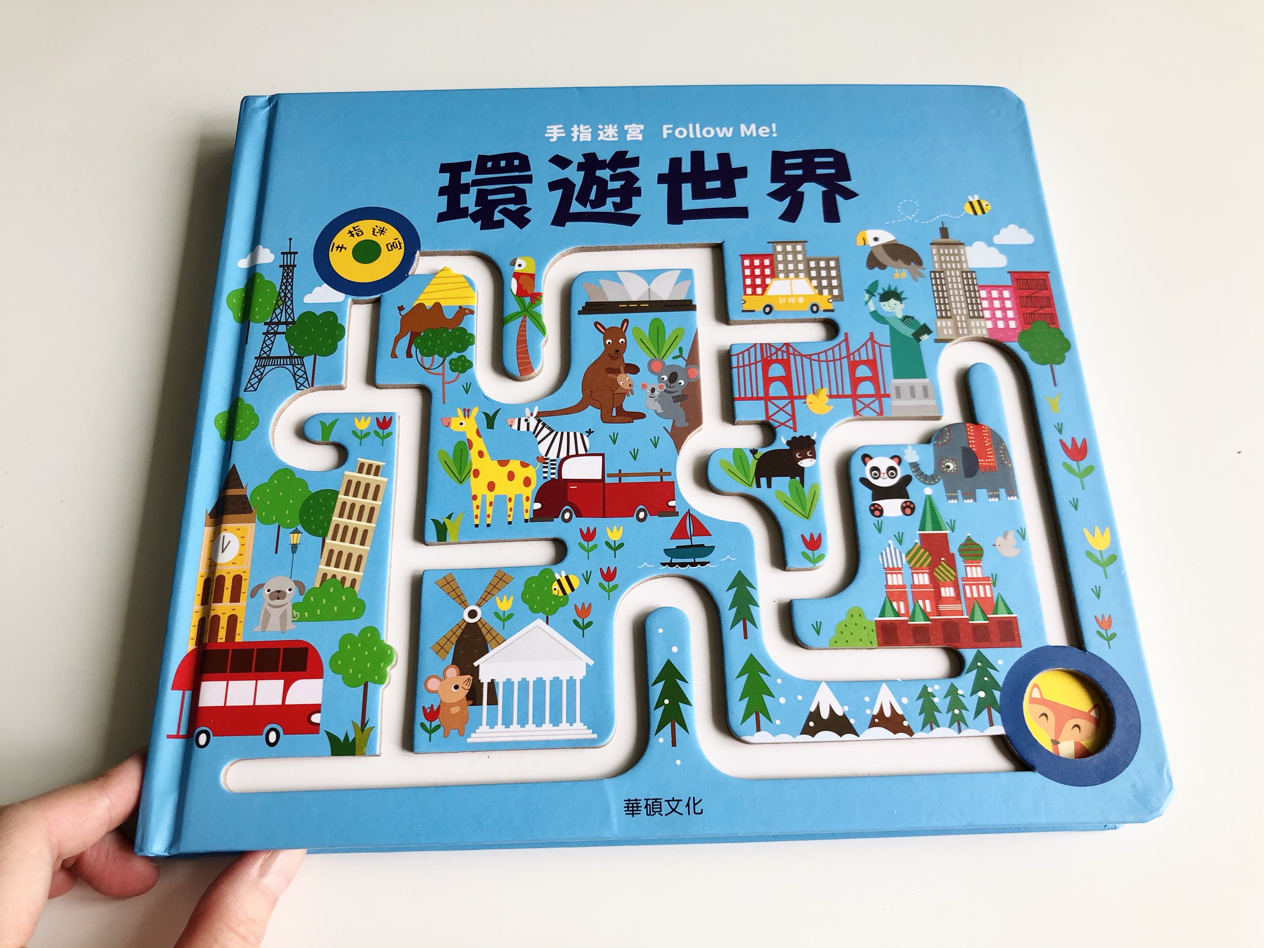 Follow Me Around The World是很少見的手指迷宮書,硬頁書不容易毀損,0 歲就可以共讀,兩歲以上孩子也能藉由手指迷宮遊戲獲得成就感。