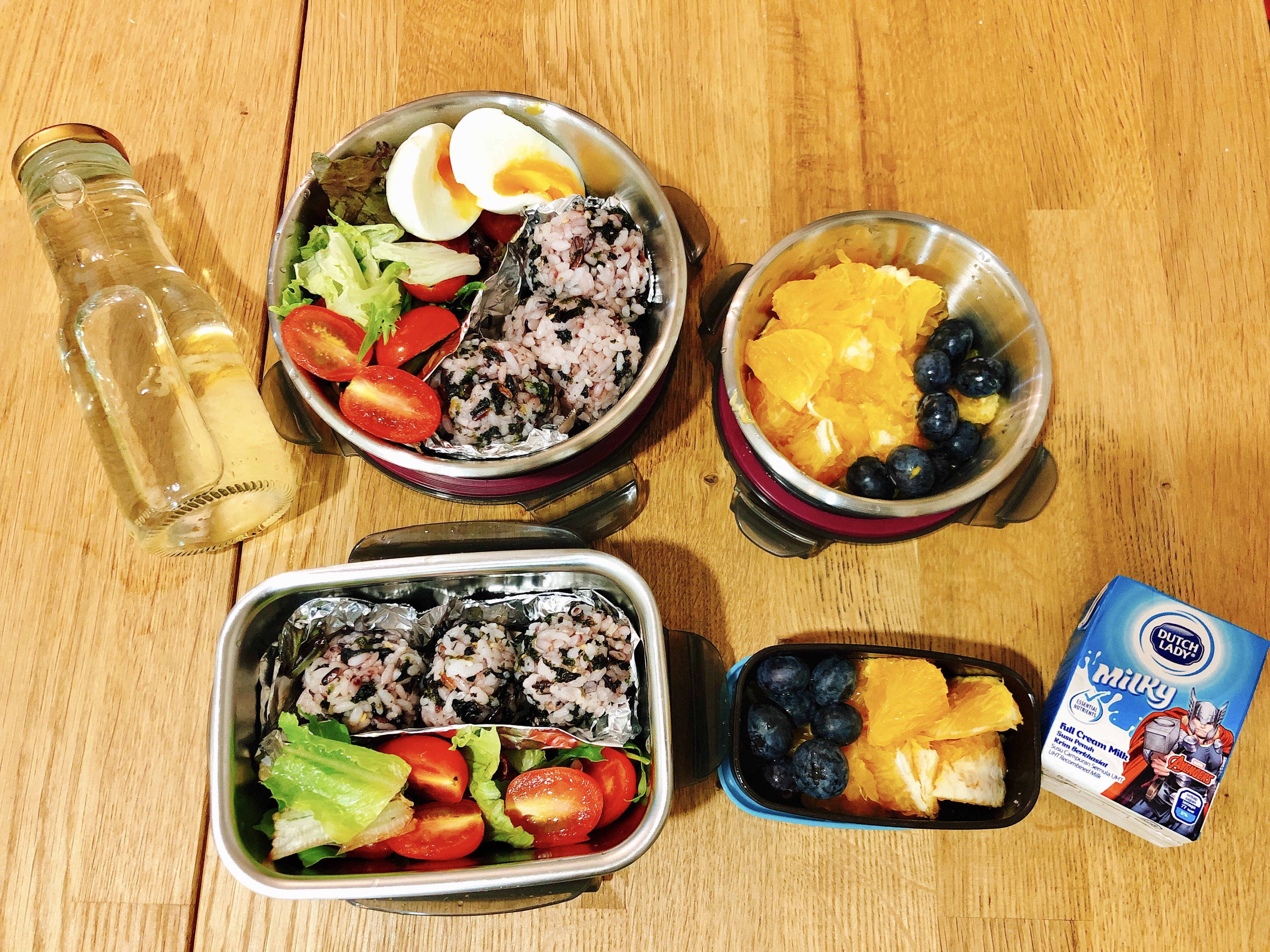 一盒雞蛋沙拉,一盒水果,一盒飯糰和地瓜,出門野餐剛剛好。