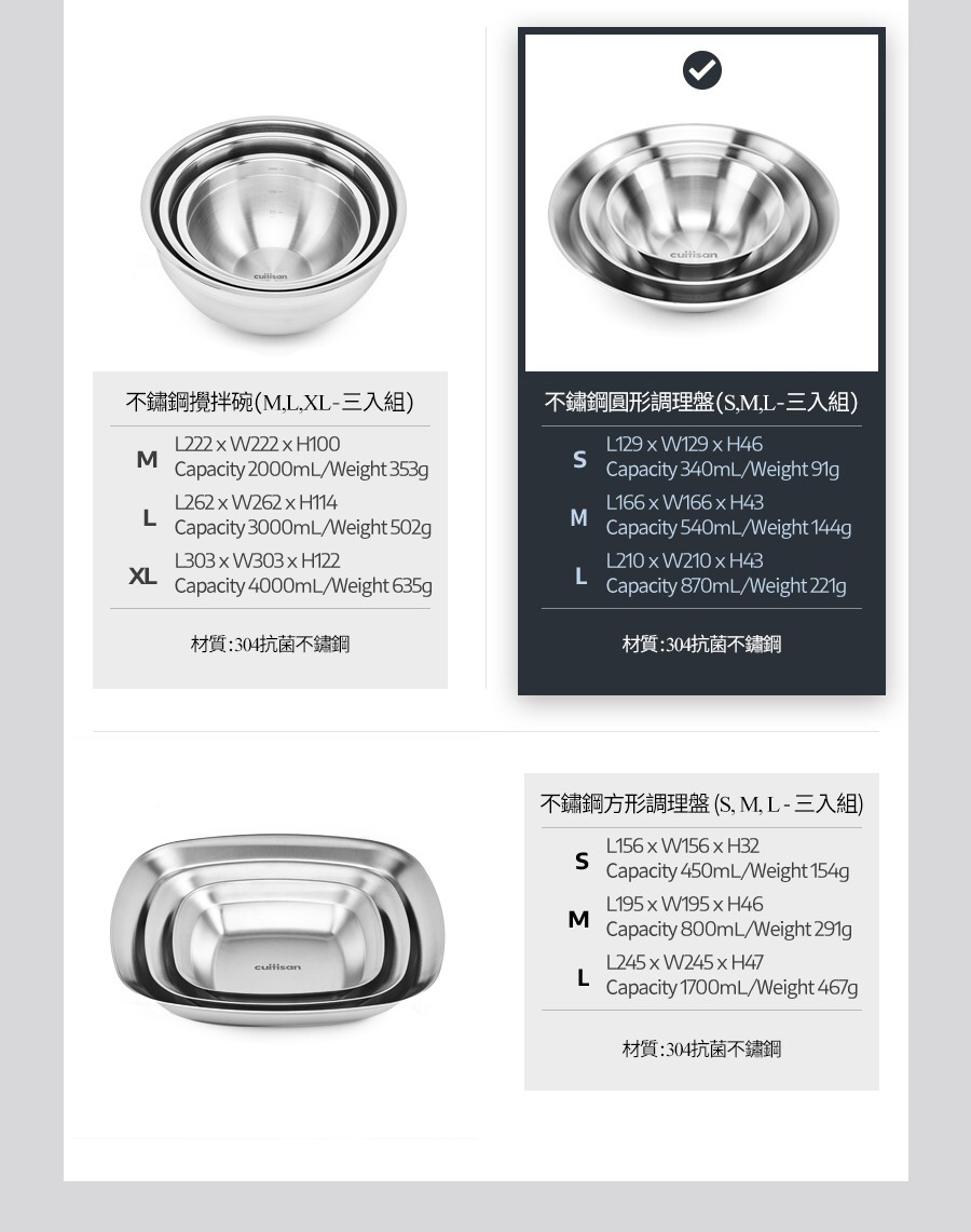 三入一組的調理盤/攪拌盆,可以選擇方形或圓形。