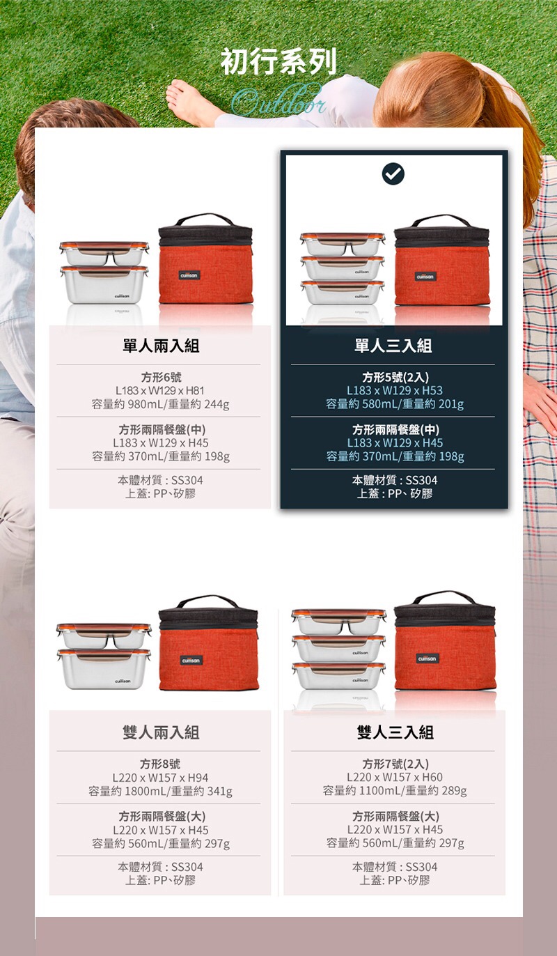 初行系列附一個質感非常棒的保溫袋,總共四款,各有2-3個保鮮盒,單人和雙人都能按照人數需求選購。
