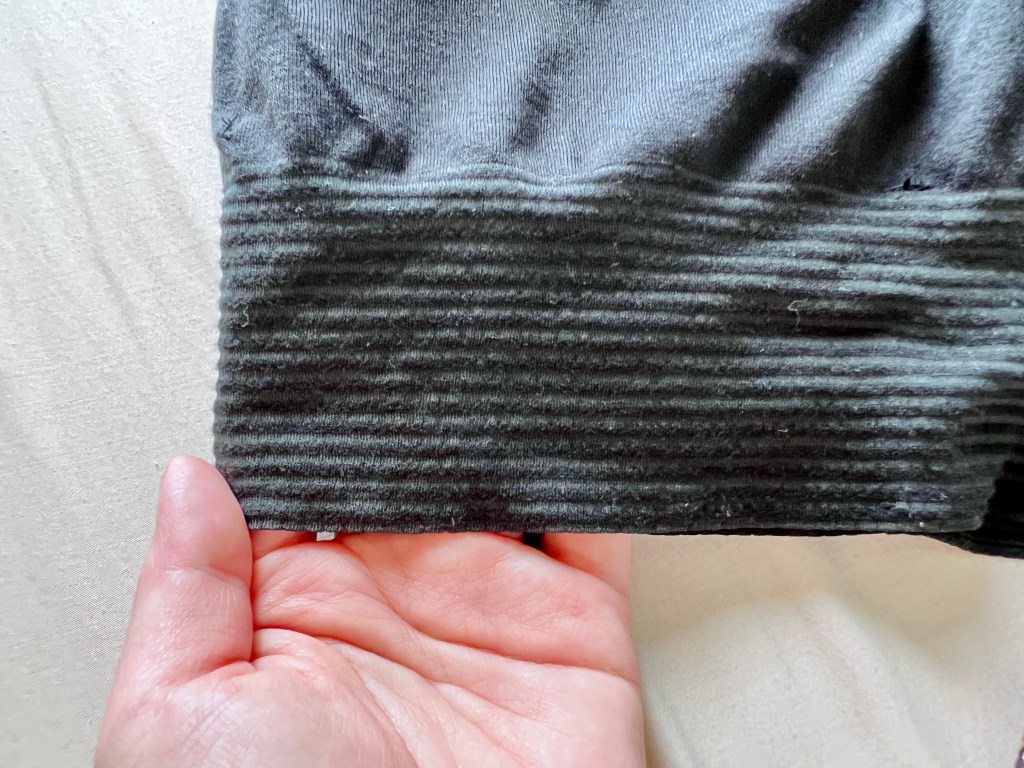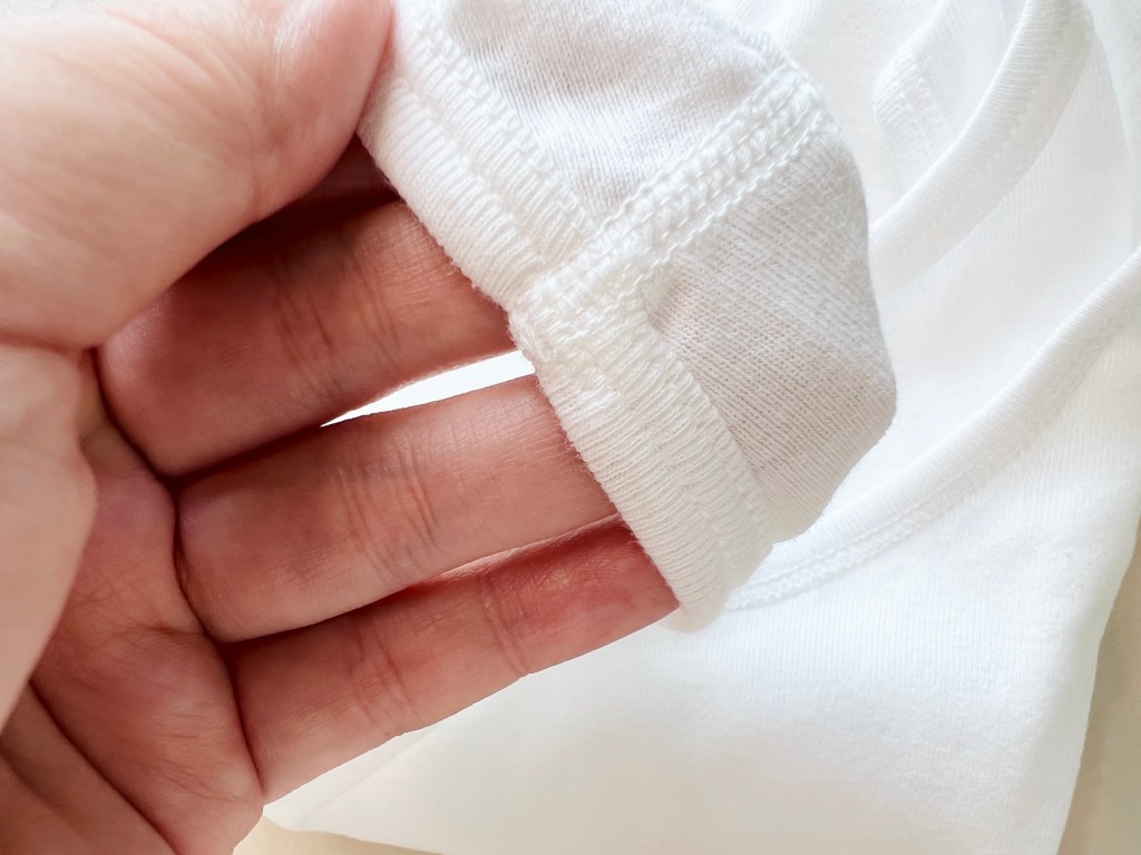 拉近一點看就很明顯了,這種有彈性的織法讓衣服更耐穿不容易變成荷葉邊。